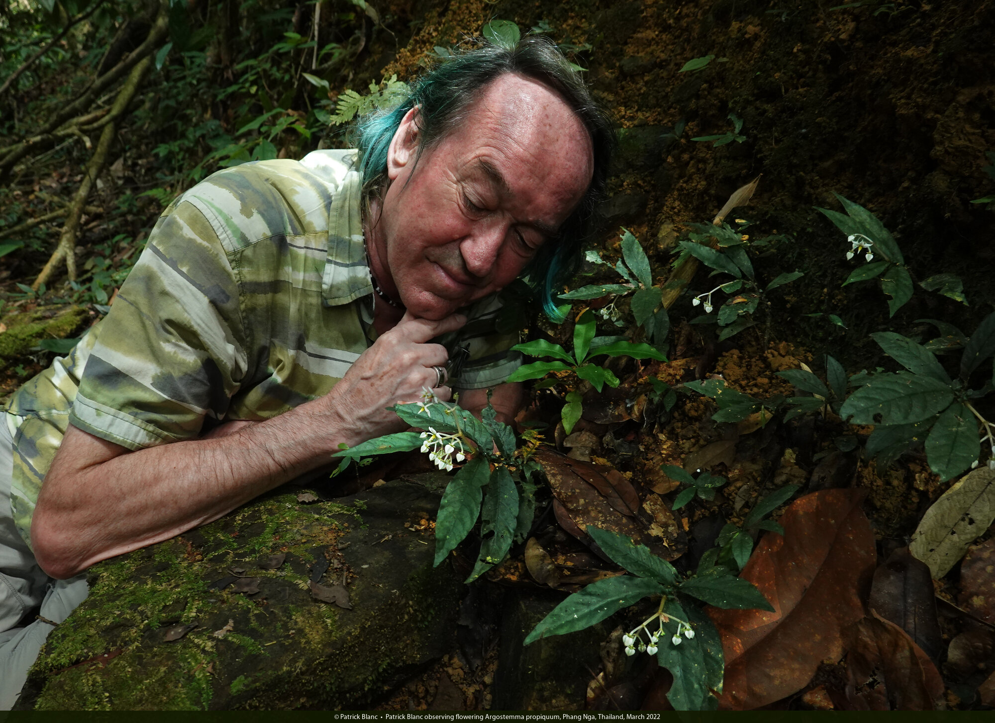 Patrick Blanc observing flowering Argostemma propiquum, Phang Nga, Thailand, March 2022