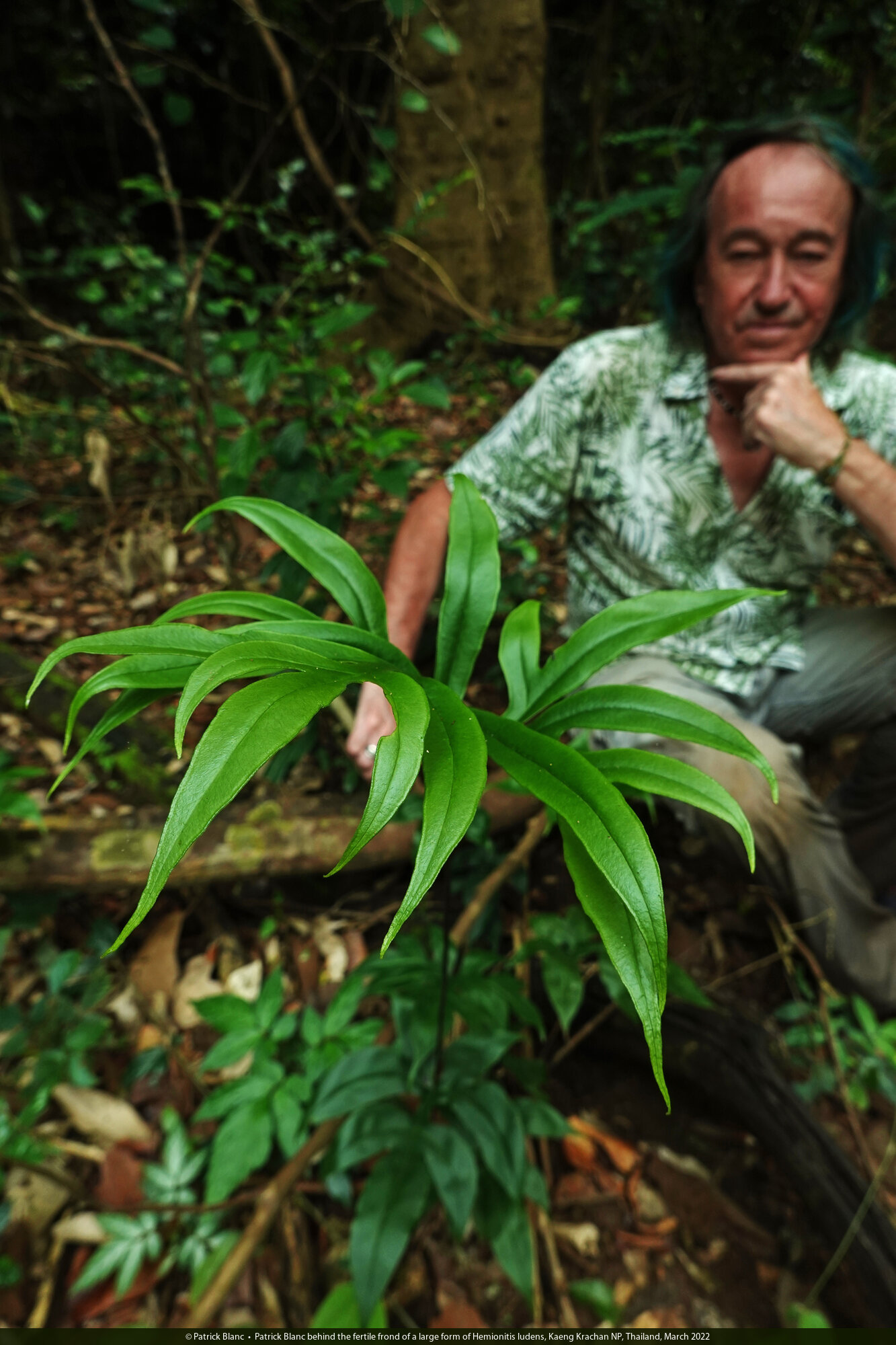 Patrick Blanc behind the fertile frond of a large form of Hemionitis ludens, Kaeng Krachan NP, Thailand, March 2022