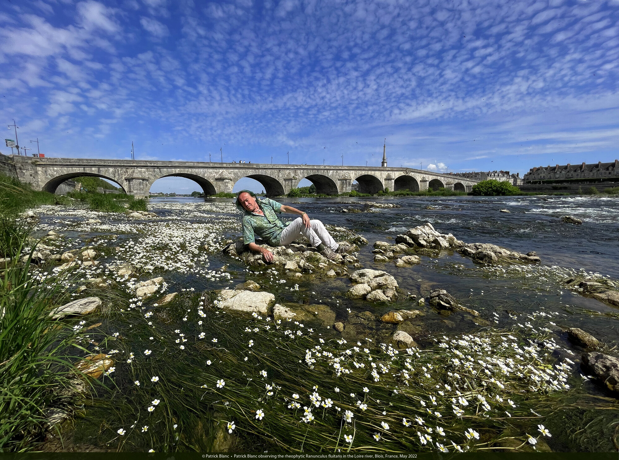 Patrick Blanc observing a dense flowering population of Ranunculus fluitans in the Loire river, Blois, France, May 2022