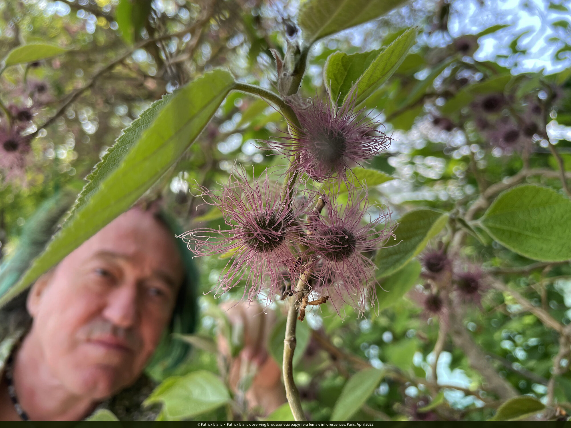 Patrick Blanc observing Broussonetia papyrifera female inflorescences, Paris, April 2022