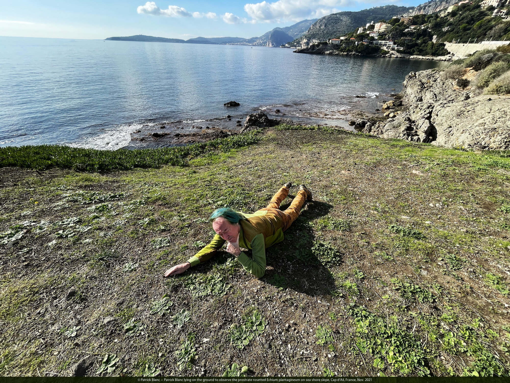 Patrick Blanc lying on the ground to observe the prostrate rosetted Echium plantagineum on sea shore slope, Cap d'Ail, France, Nov. 2021