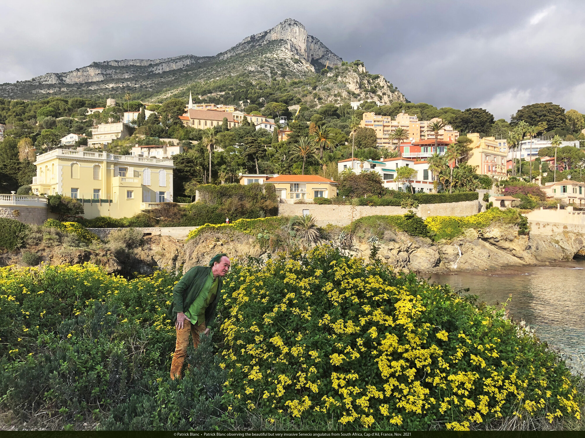 Patrick Blanc observing the beautiful but very invasive Senecio angulatus from South Africa, Cap d'Ail, France, Nov. 2021