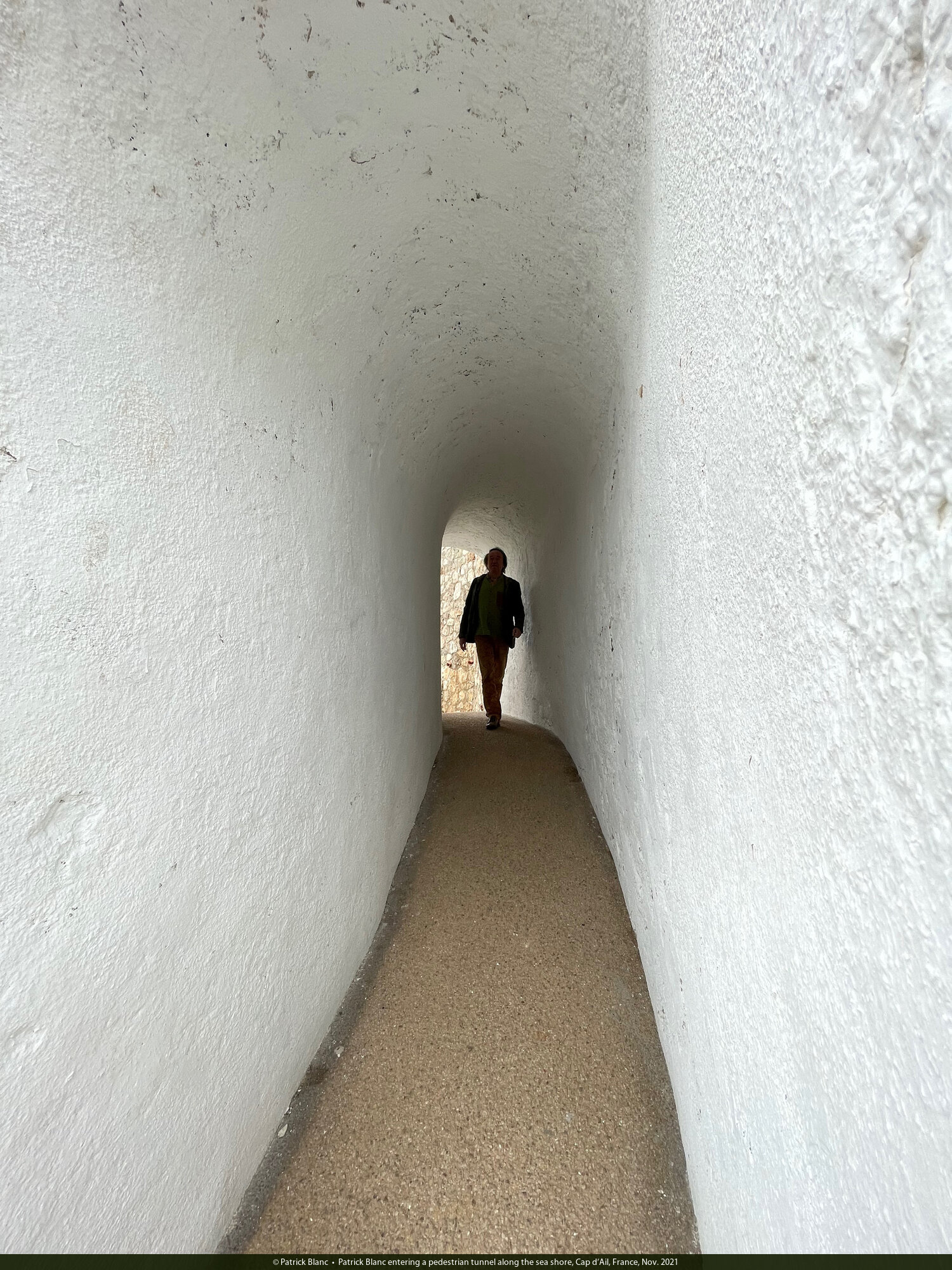Patrick Blanc entering a pedestrian tunnel along the sea shore, Cap d'Ail, France, Nov. 2021