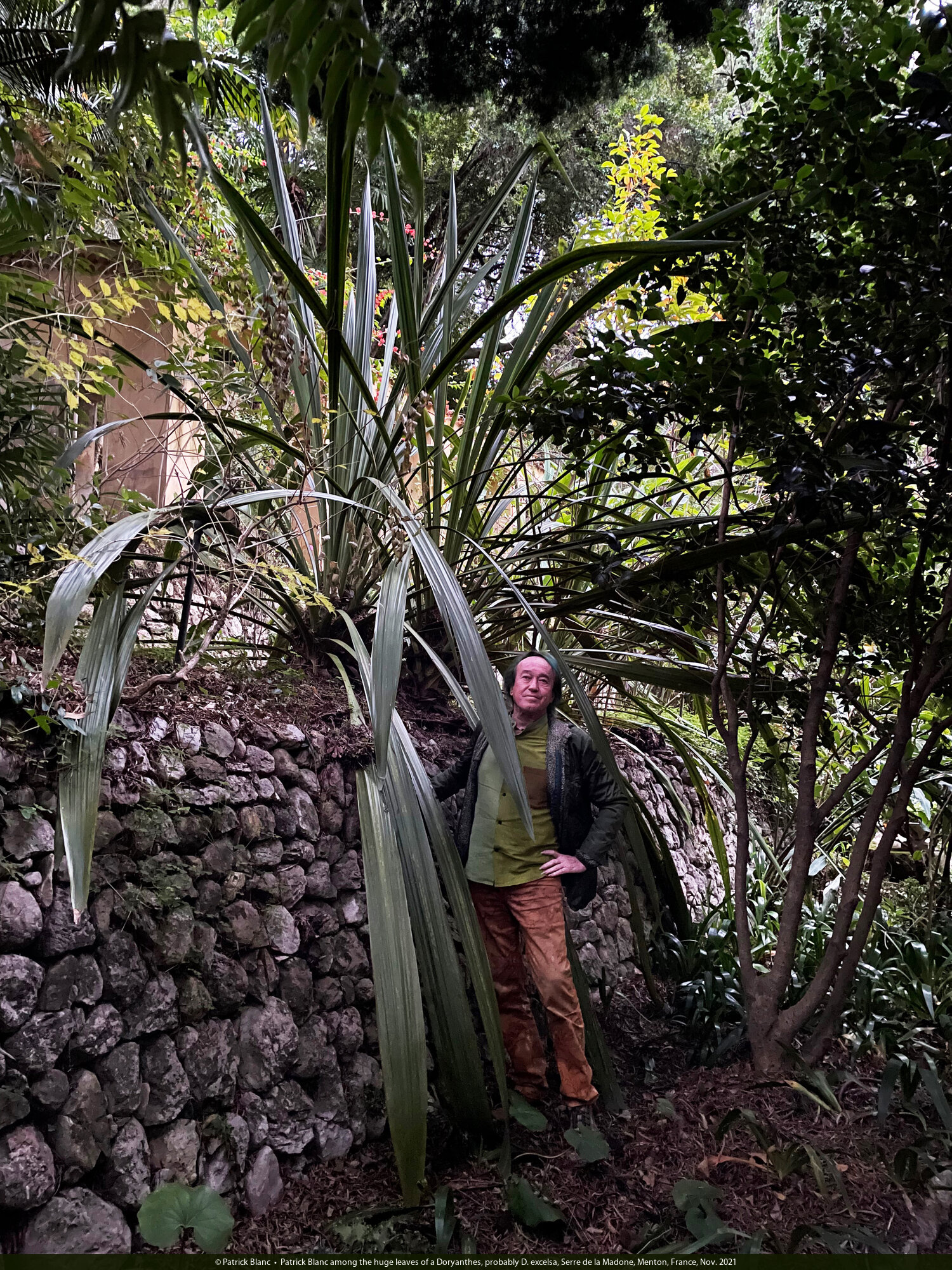 Patrick Blanc among the huge leaves of a Doryanthes, probably D. excelsa, Serre de la Madone, Menton, France, Nov. 2021