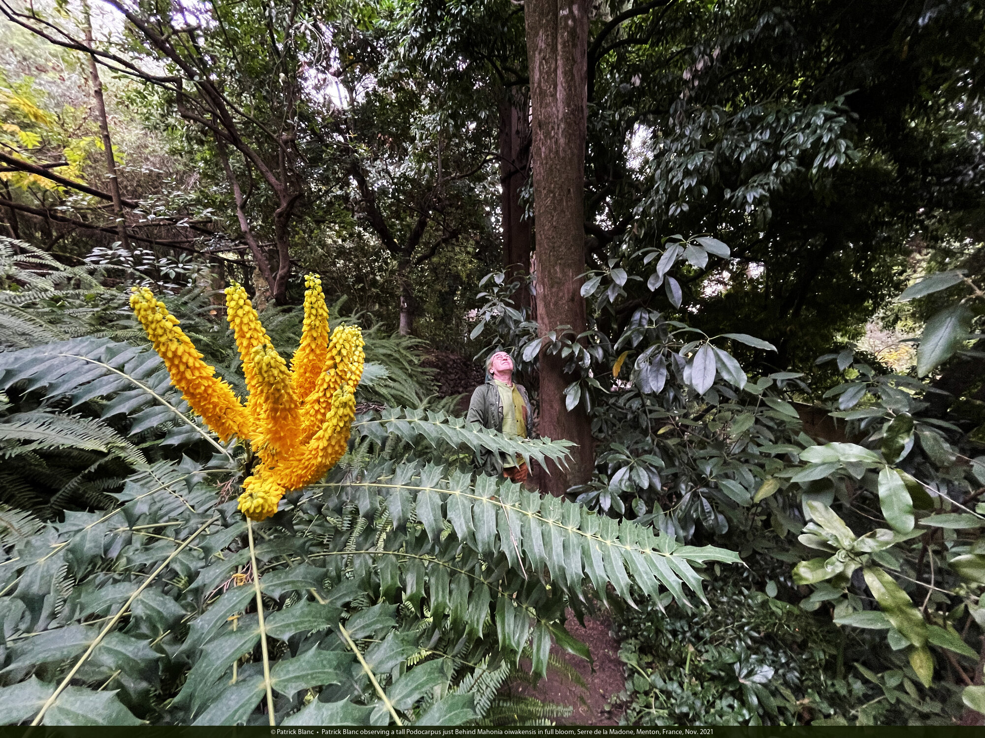 Patrick Blanc observing a tall Podocarpus just Behind Mahonia oiwakensis in full bloom, Serre de la Madone, Menton, France, Nov. 2021