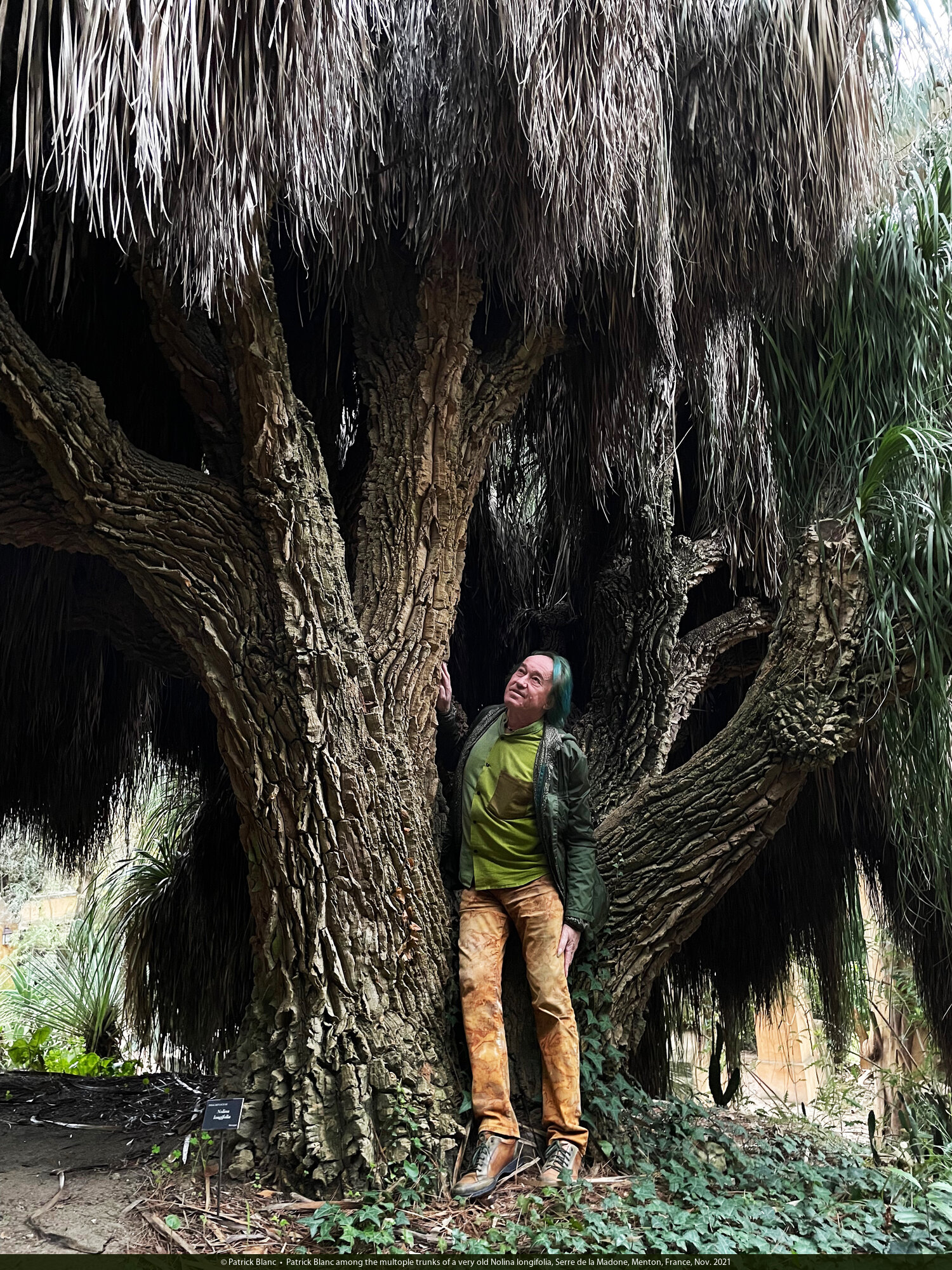Patrick Blanc among the multople trunks of a very old Nolina longifolia, Serre de la Madone, Menton, France, Nov. 2021