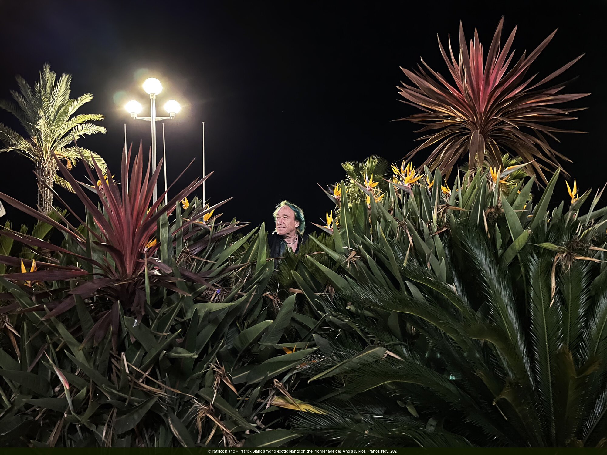 Patrick Blanc among exotic plants on the Promenade des Anglais, Nice, France, Nov. 2021