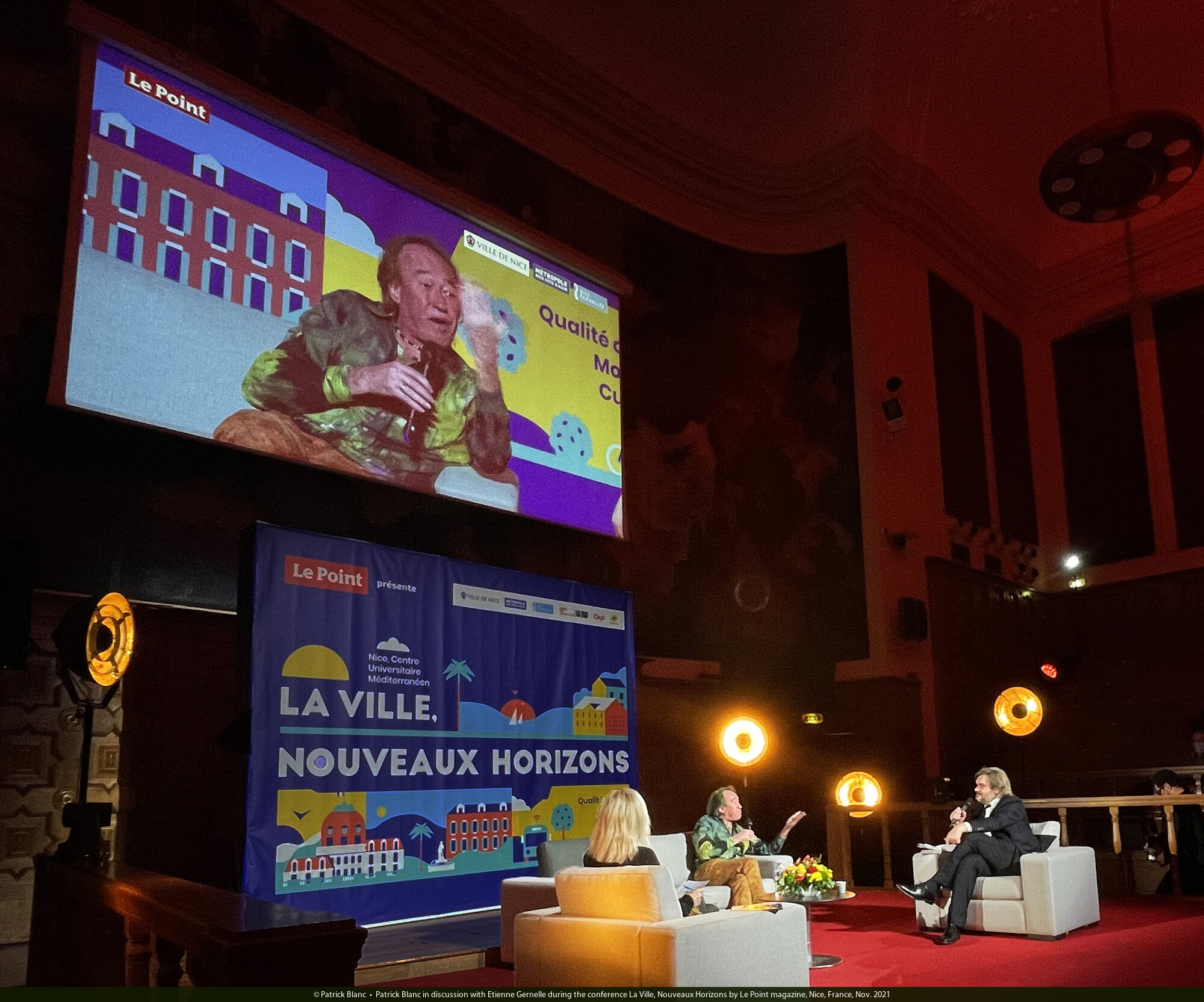 Patrick Blanc in discussion with Etienne Gernelle during the conference La Ville, Nouveaux Horizons by Le Point magazine, Nice, France, Nov. 2021