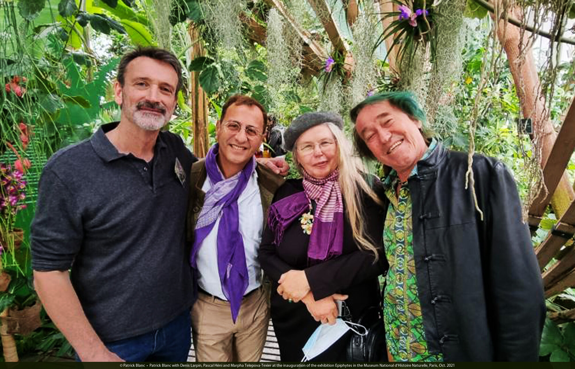 Patrick Blanc with Denis Larpin, Pascal Héni and Marpha Telepova-Texier at the inauguration of the exhibition Epiphytes in the Museum National d'Histoire Naturelle, Paris, Oct. 2021