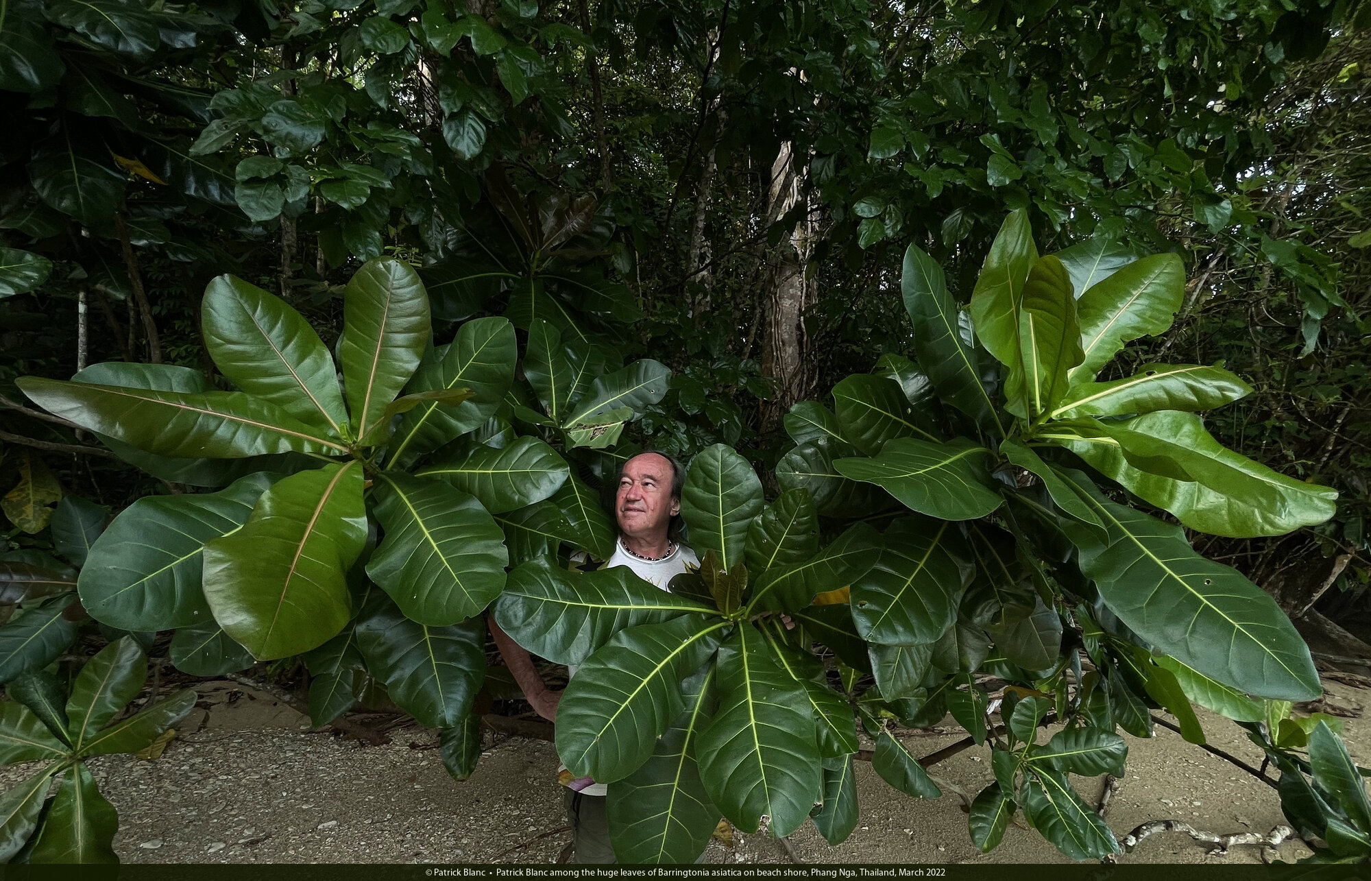 Patrick Blanc among the huge leaves of Barringtonia asiatica on beach shore, Phang Nga, Thailand, March 2022