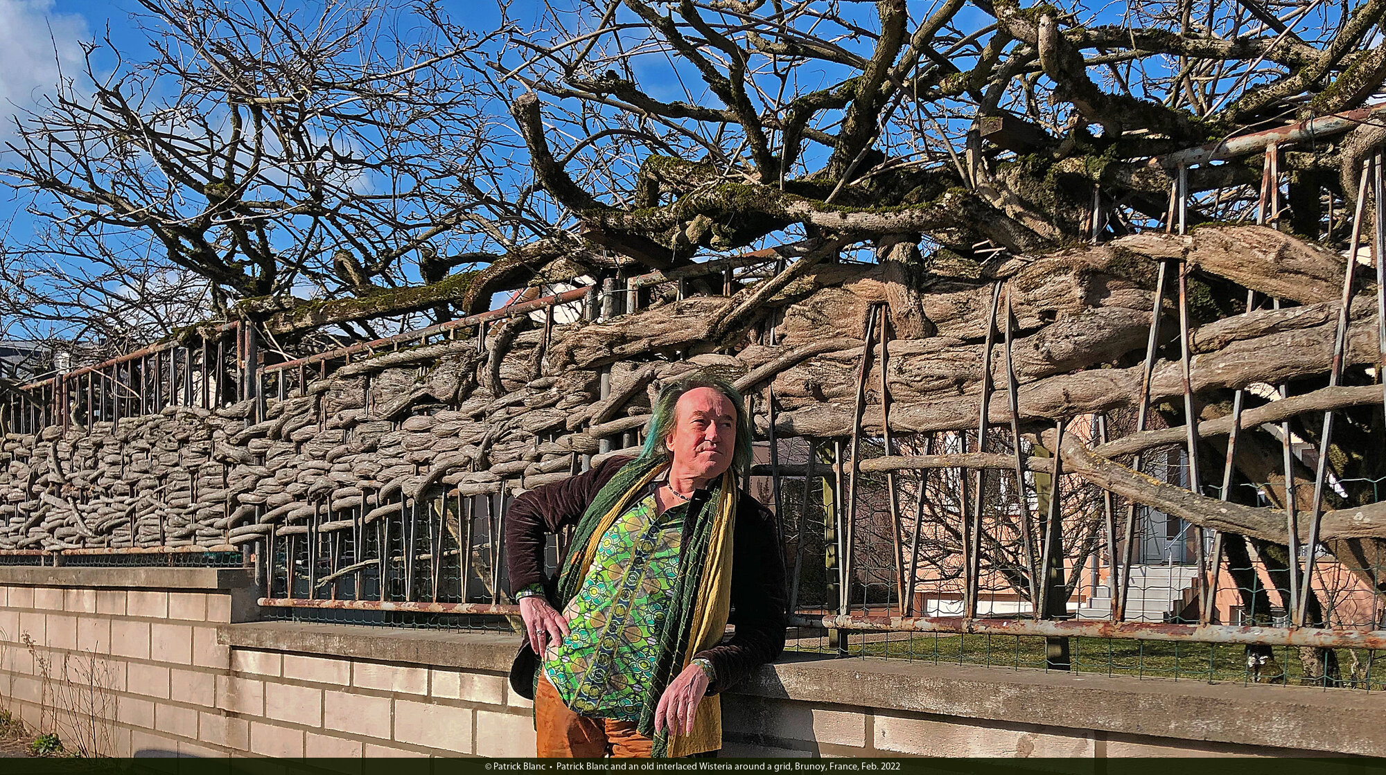 Patrick Blanc and an old interlaced Wisteria around a grid, Brunoy, France, Feb. 2022