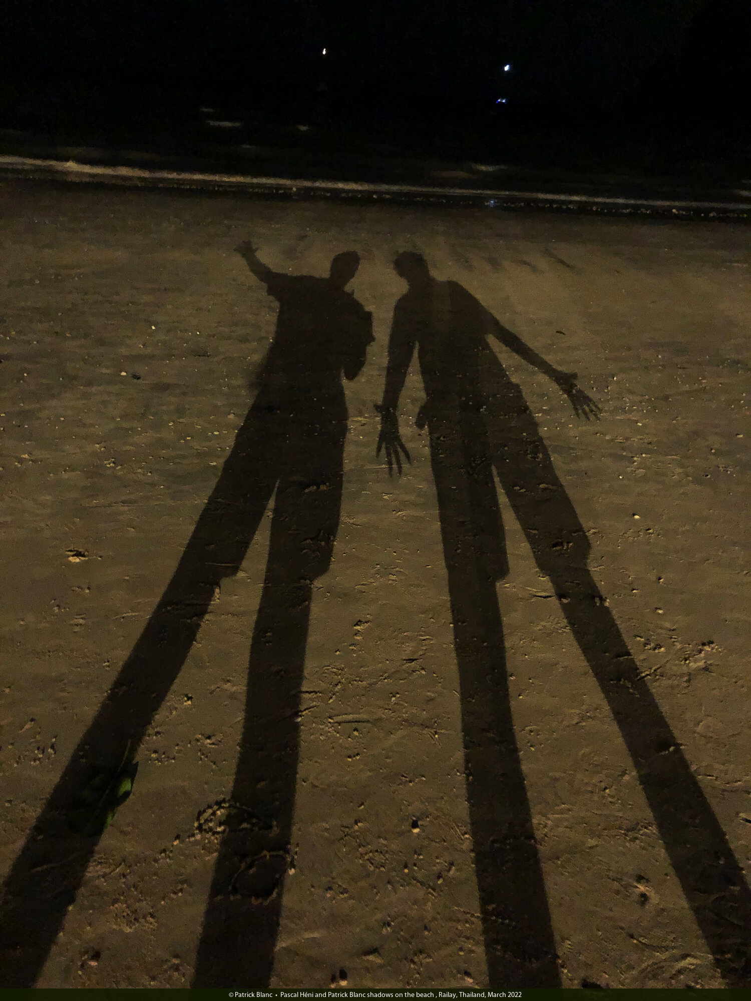Pascal Héni and Patrick Blanc shadows on the beach , Railay, Thailand, March 2022