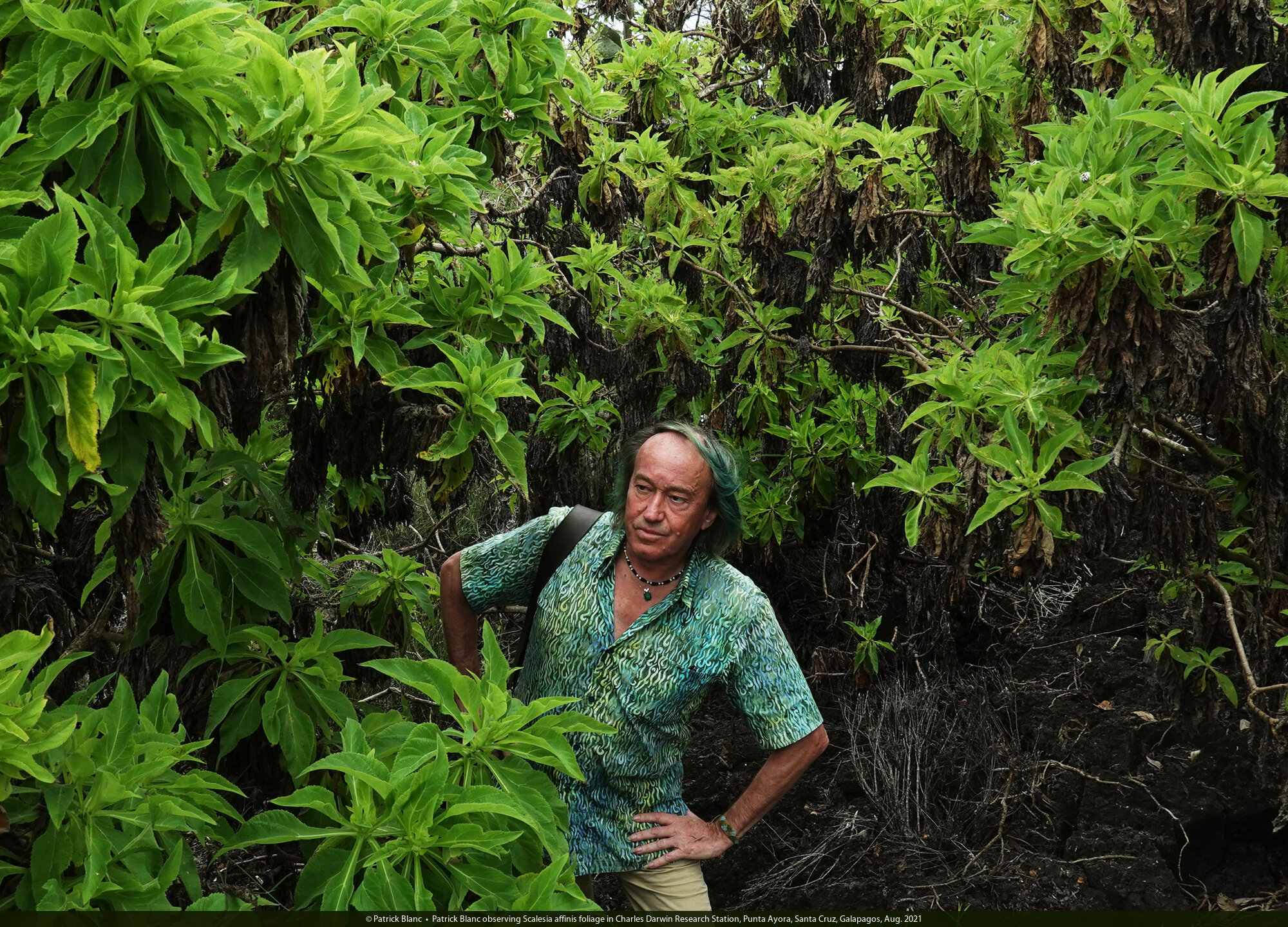 Patrick Blanc observing Scalesia affinis foliage in Charles Darwin Research Station, Punta Ayora, Santa Cruz, Galapagos, Aug. 2021
