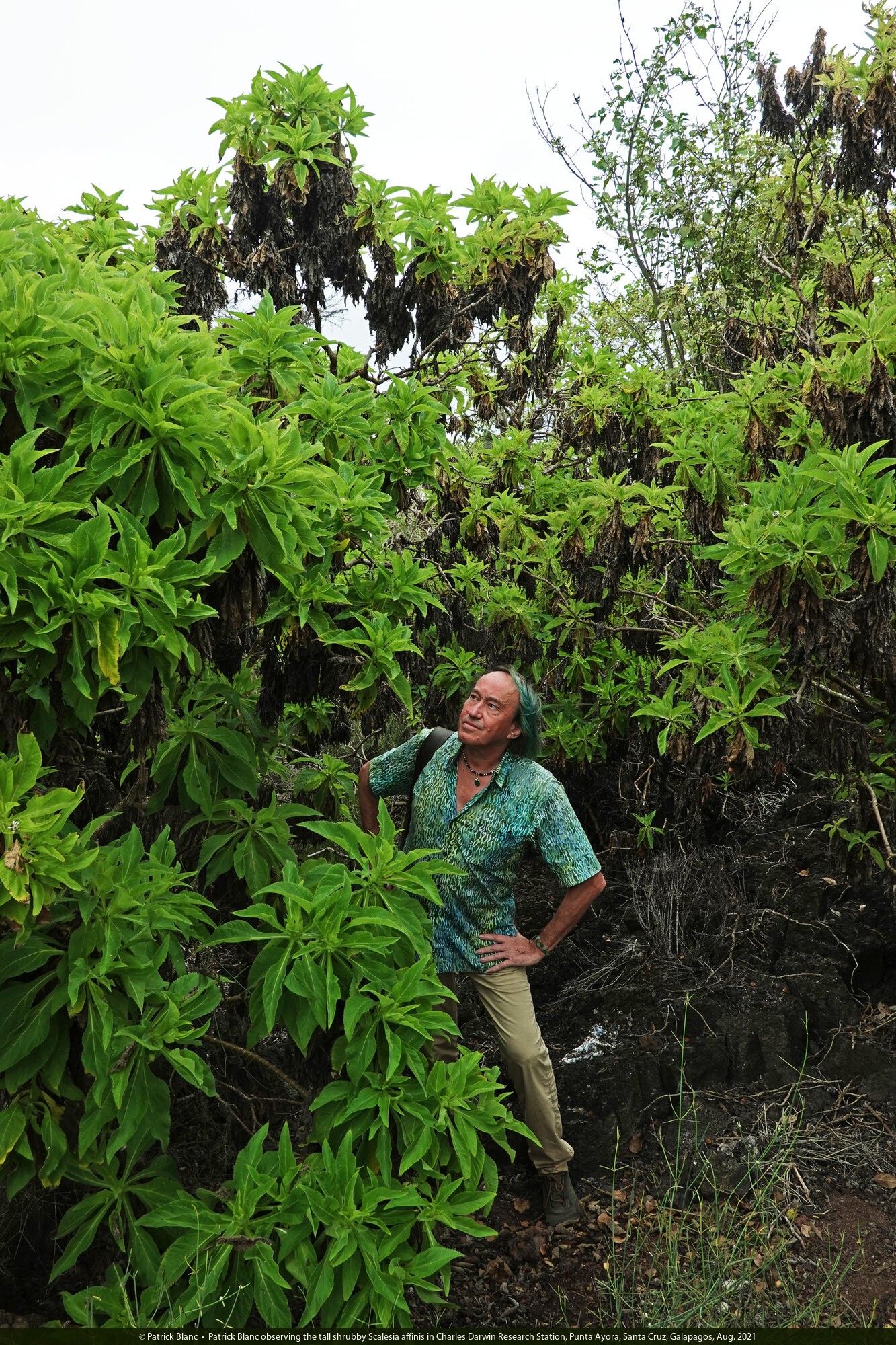 Patrick Blanc observing the tall shrubby Scalesia affinis in Charles Darwin Research Station, Punta Ayora, Santa Cruz, Galapagos, Aug. 2021