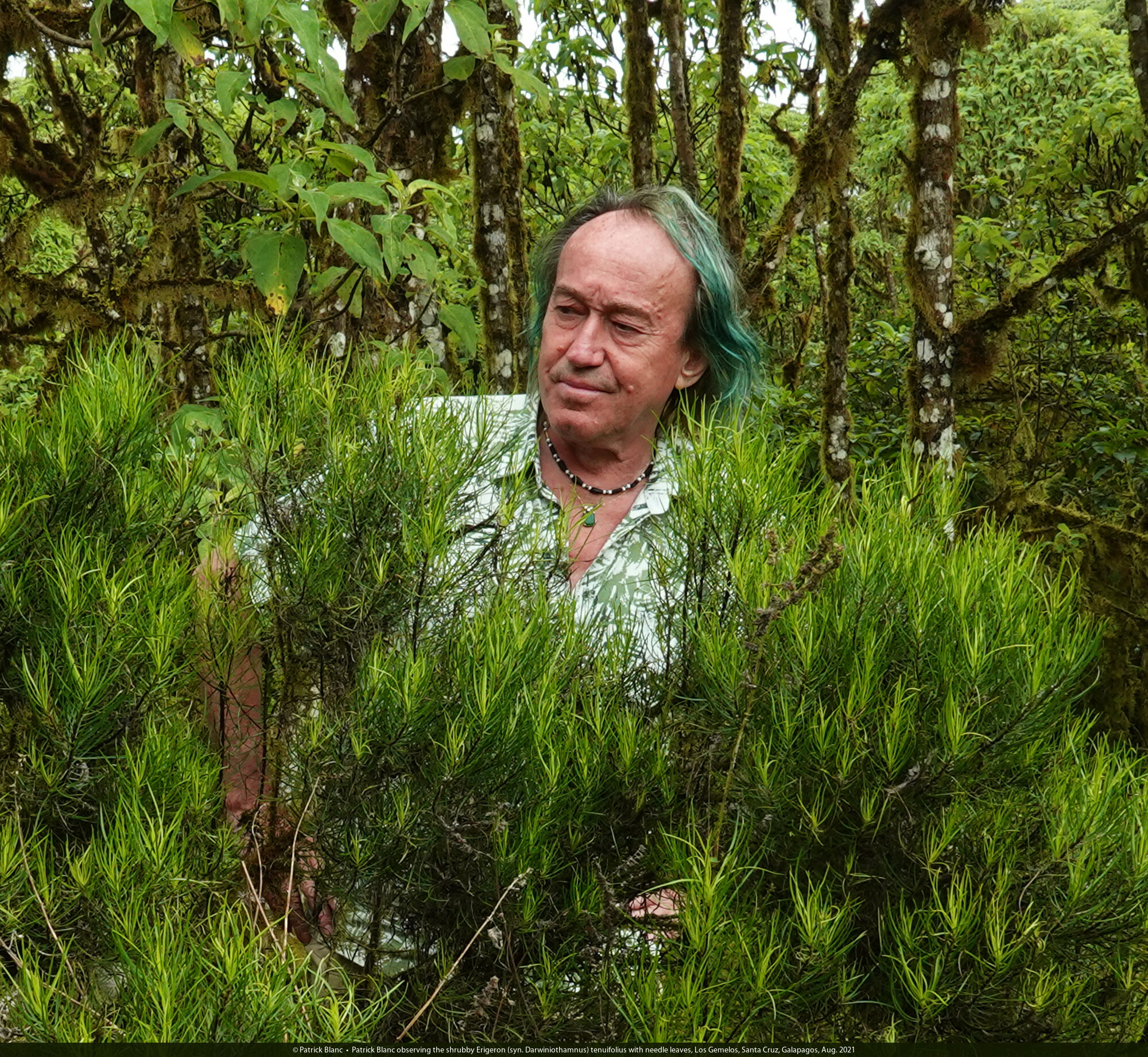 Patrick Blanc between two Asteraceae species, the shrubby Erigeron (syn. Darwiniothamnus) tenuifolius with needle leaves and the forest of the tree Scalesia pedunculata, Los Gemelos, Santa Cruz, Galapagos, Aug. 2021