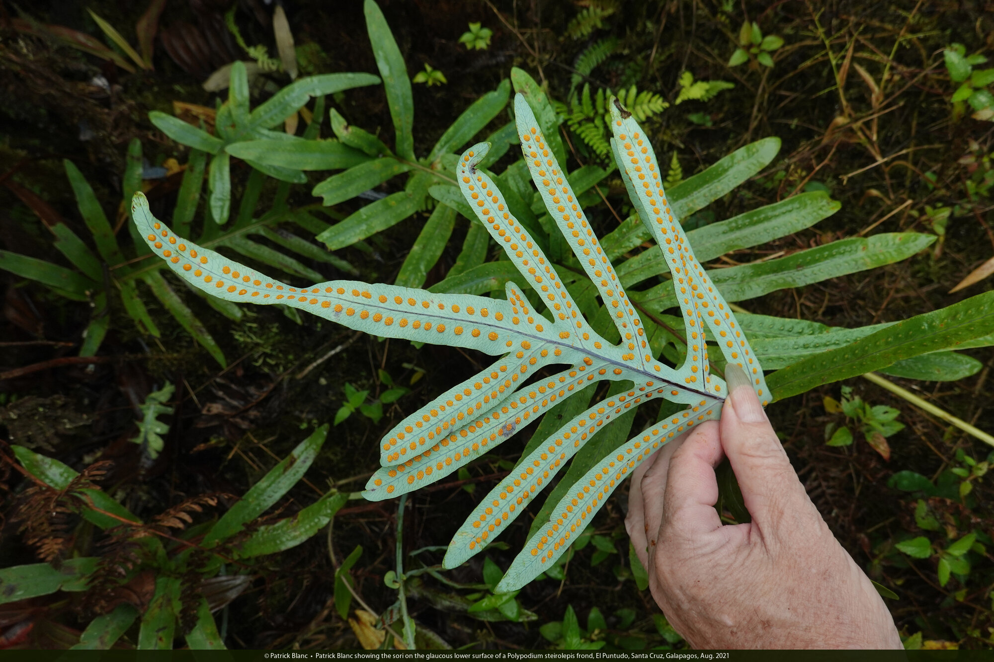 Patrick Blanc showing the sori on the glaucous lower surface of a Phlebodium pseudoaureum frond, El Puntudo, Santa Cruz, Galapagos, Aug. 2021