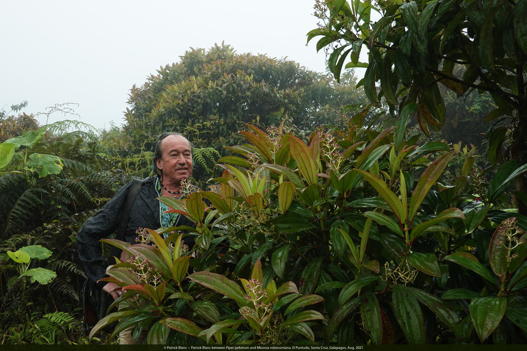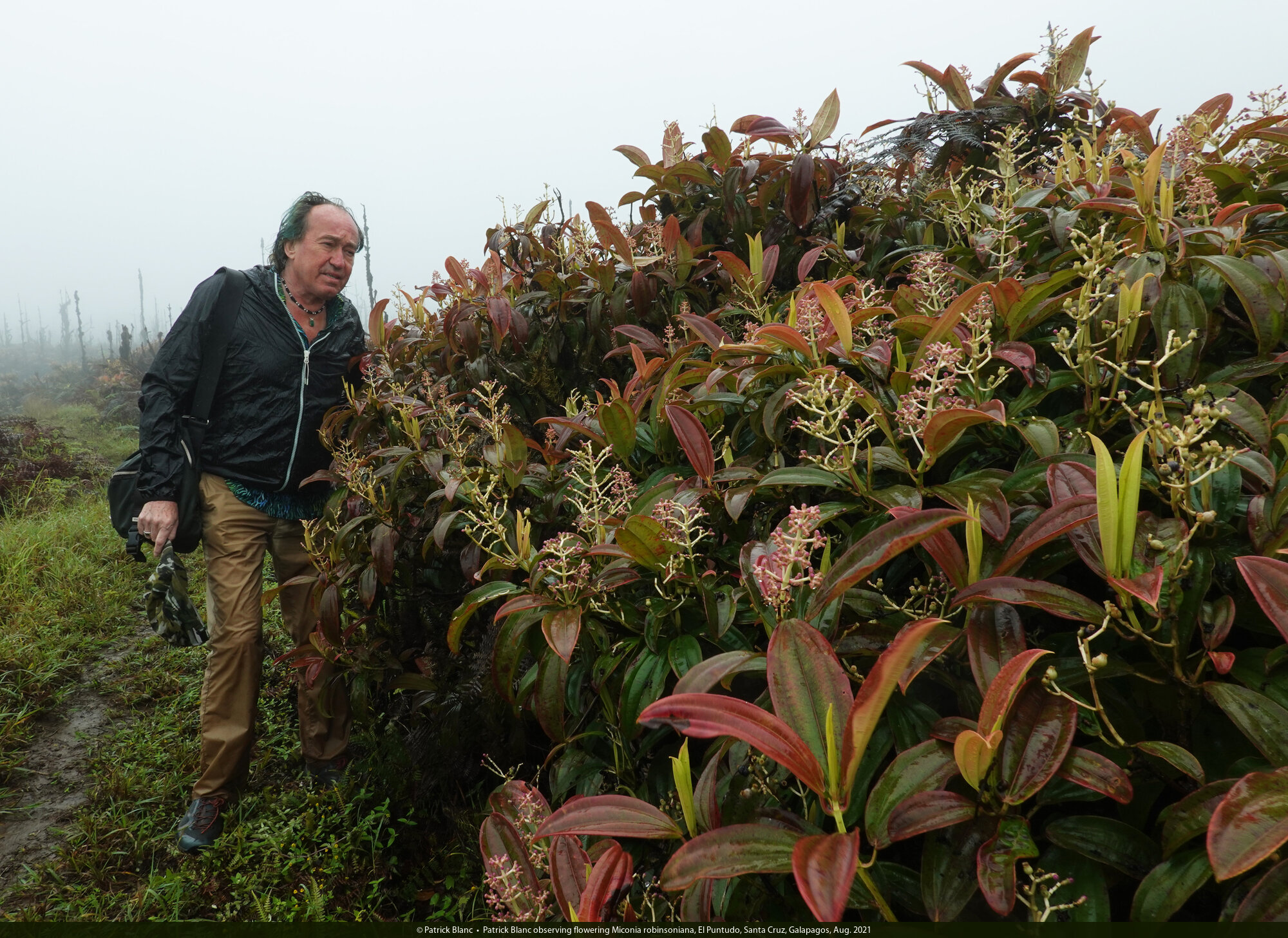 Patrick Blanc observing flowering Miconia robinsoniana, El Puntudo, Santa Cruz, Galapagos, Aug. 2021