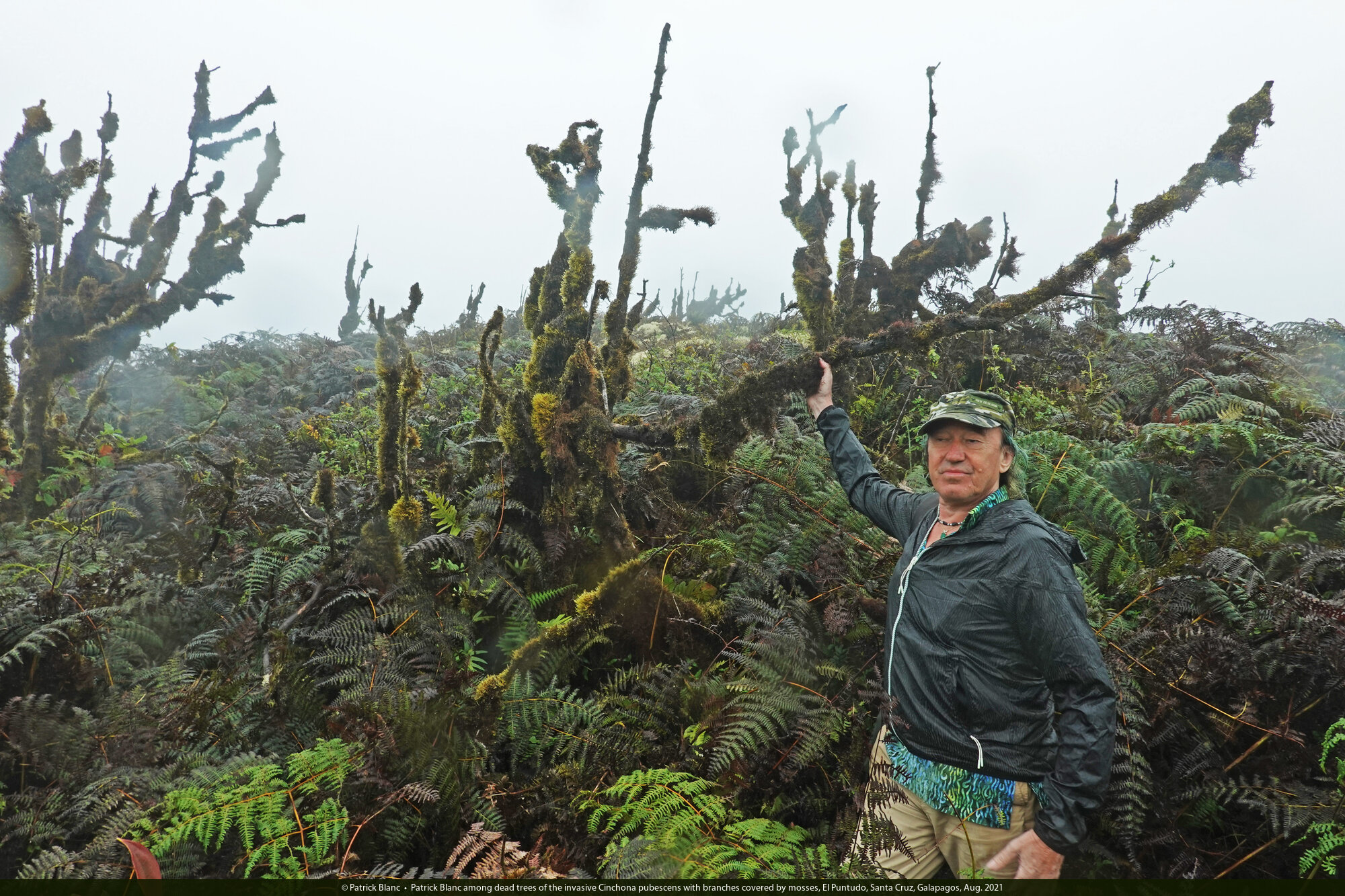 Patrick Blanc among dead trees of the invasive Cinchona pubescens with branches covered by mosses, El Puntudo, Santa Cruz, Galapagos, Aug. 2021