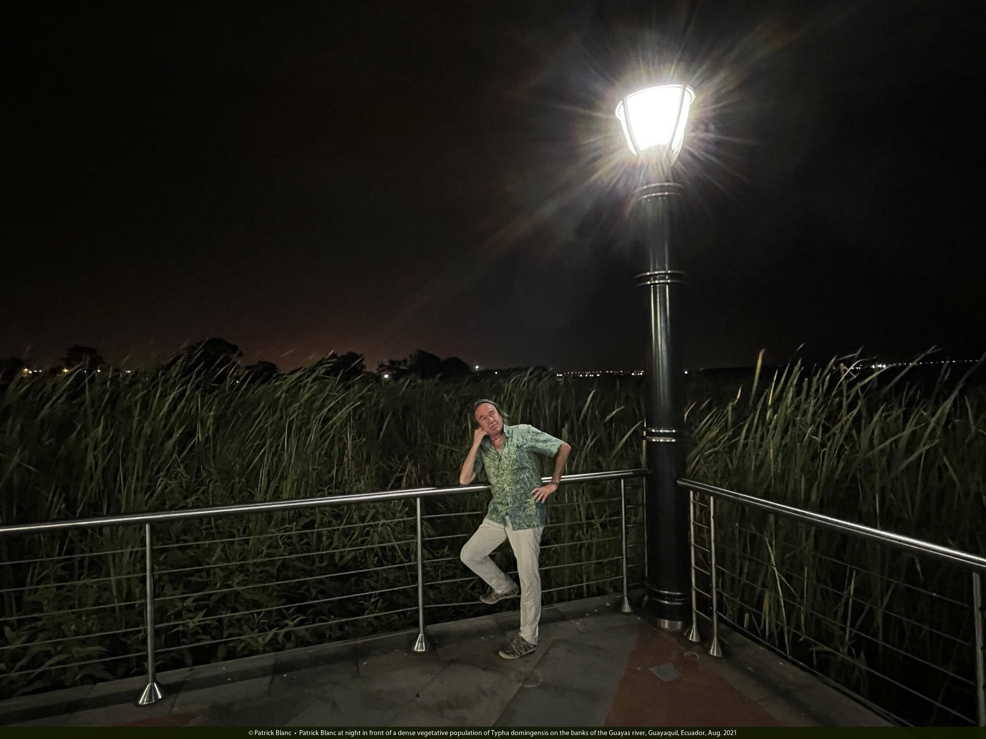 Patrick Blanc at night in front of a dense vegetative population of Typha domingensis on the banks of the Guayas river, Guayaquil, Ecuador, Aug. 2021