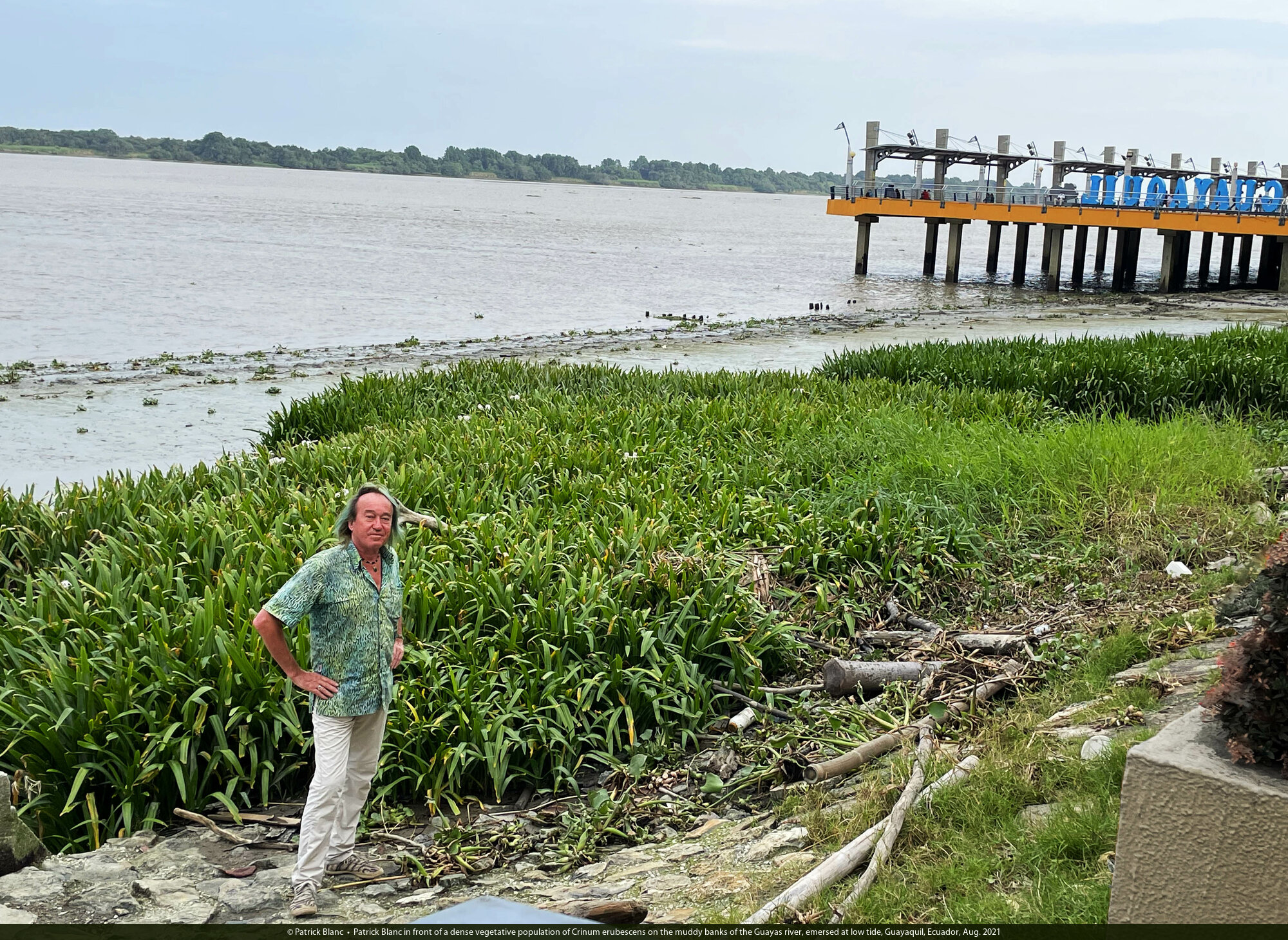 Patrick Blanc in front of a flowering population of Crinum erubescens emersed at low tide along the Rio Guayas banks, Guayaquil, Ecuador, Aug. 2021