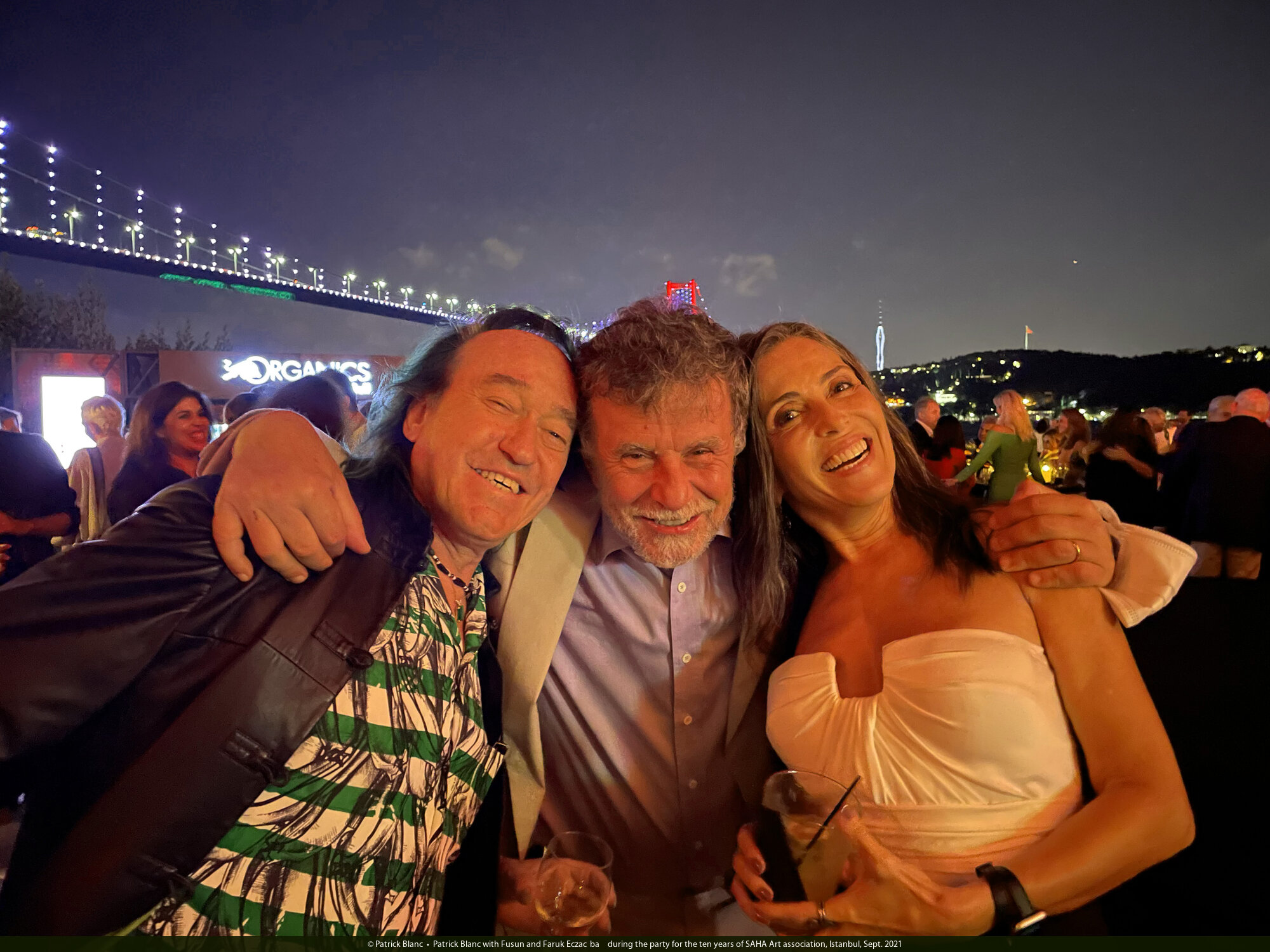 Patrick Blanc with Fusun and Faruk Eczacıbaşı during the party for the ten years of SAHA Art association, Istanbul, Sept. 2021