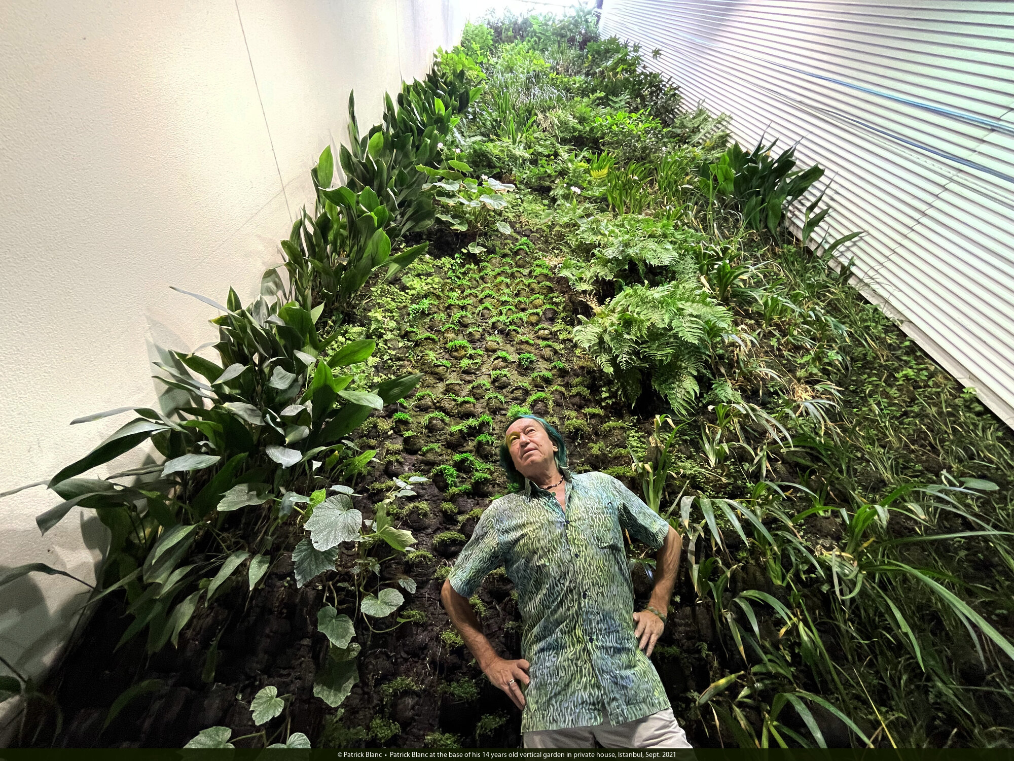Patrick Blanc at the base of his 14 years old vertical garden in private house, Istanbul, Sept. 2021