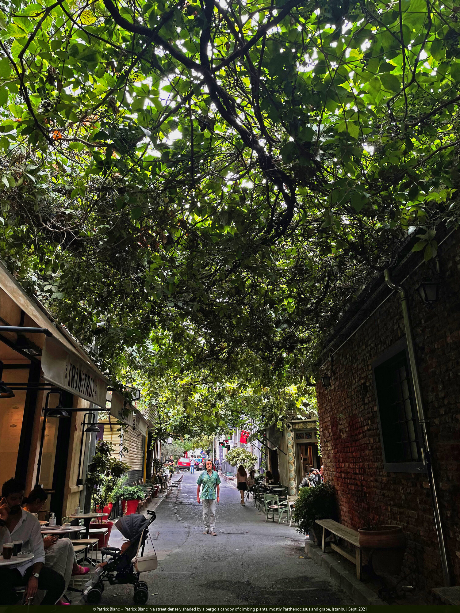 Patrick Blanc in a street densely shaded by a pergola canopy of climbing plants, mostly Parthenocissus and grape, Istanbul, Sept. 2021