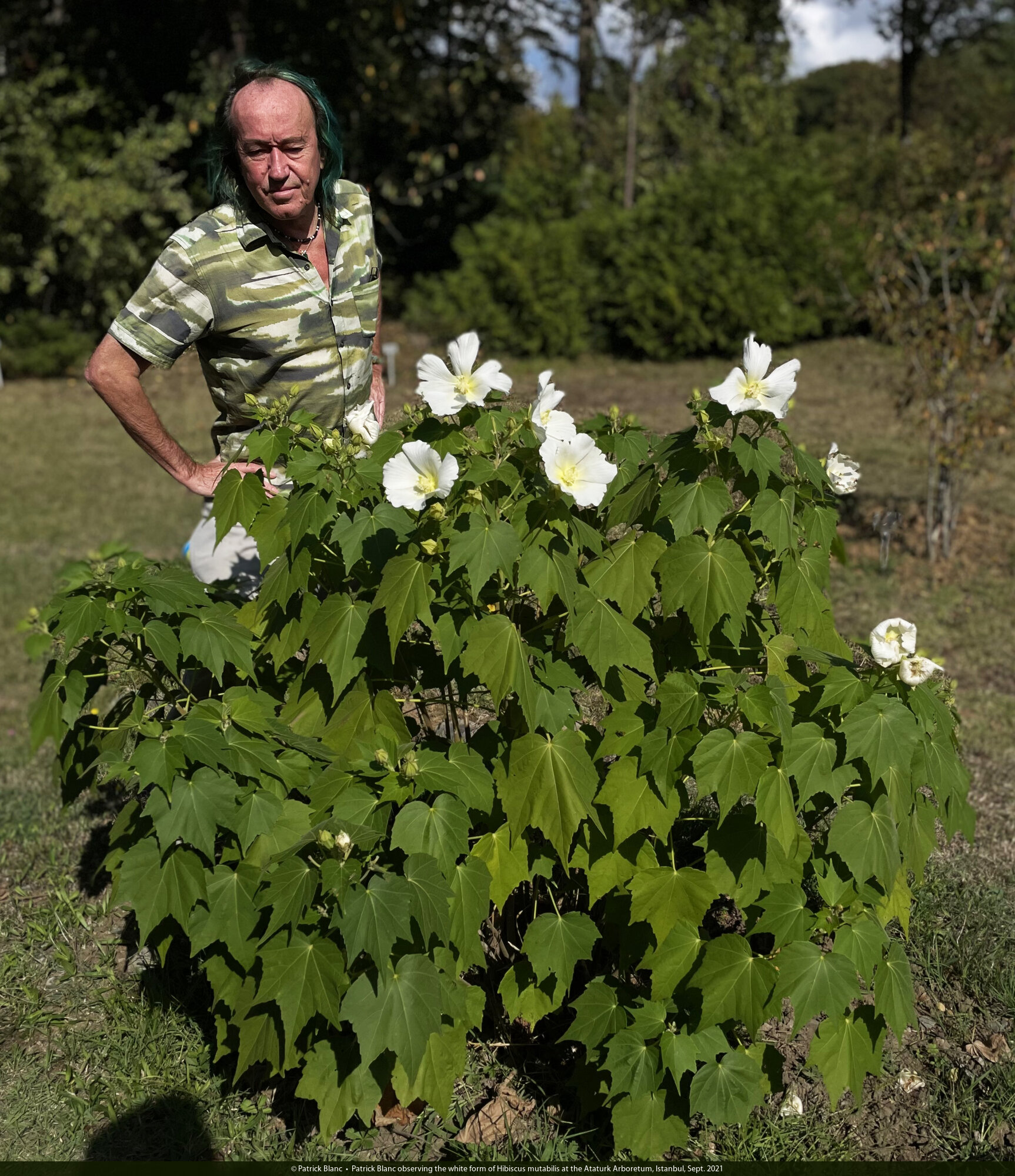 Patrick Blanc observing the white form of Hibiscus mutabilis at the Ataturk Arboretum, Istanbul, Sept. 2021