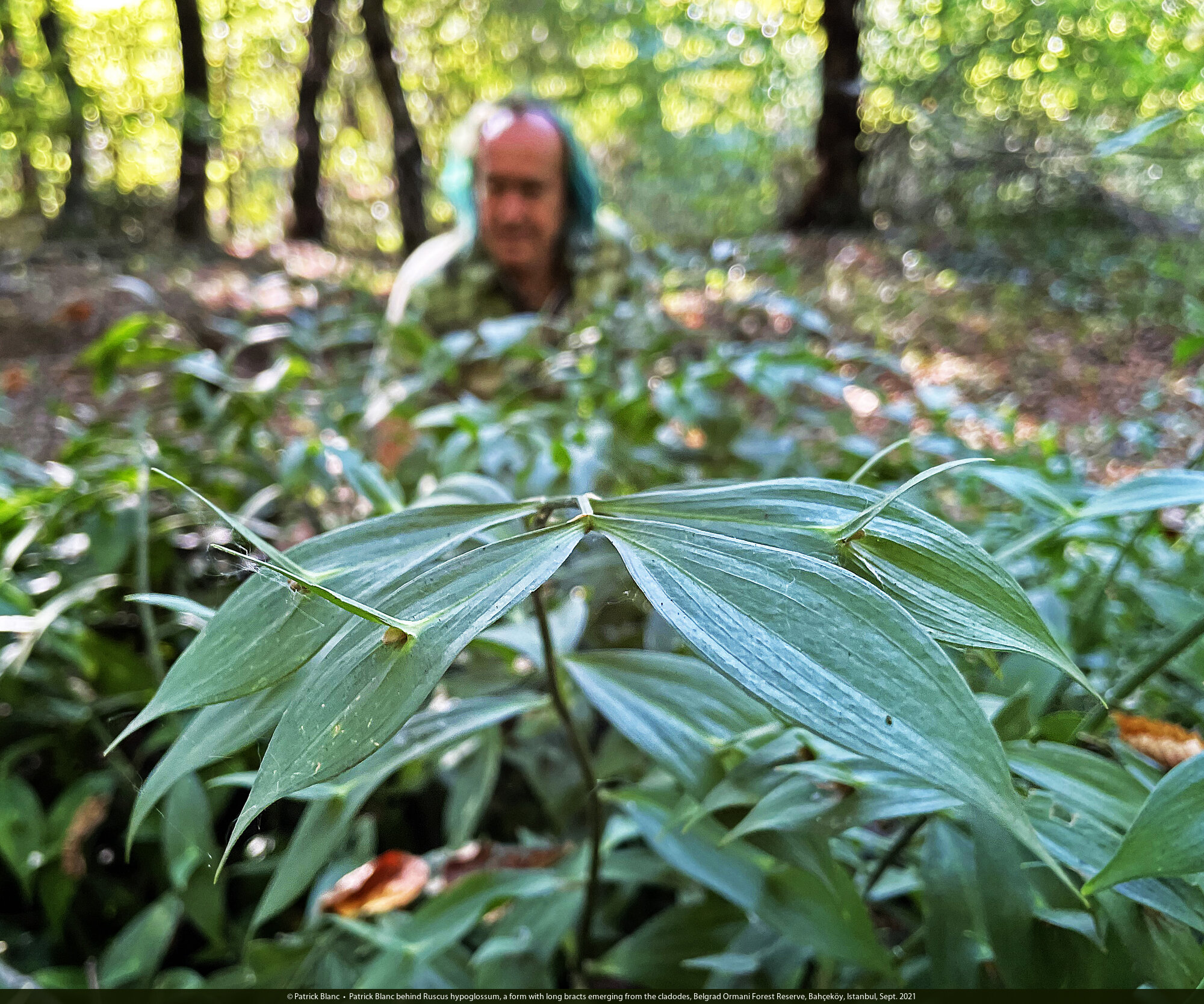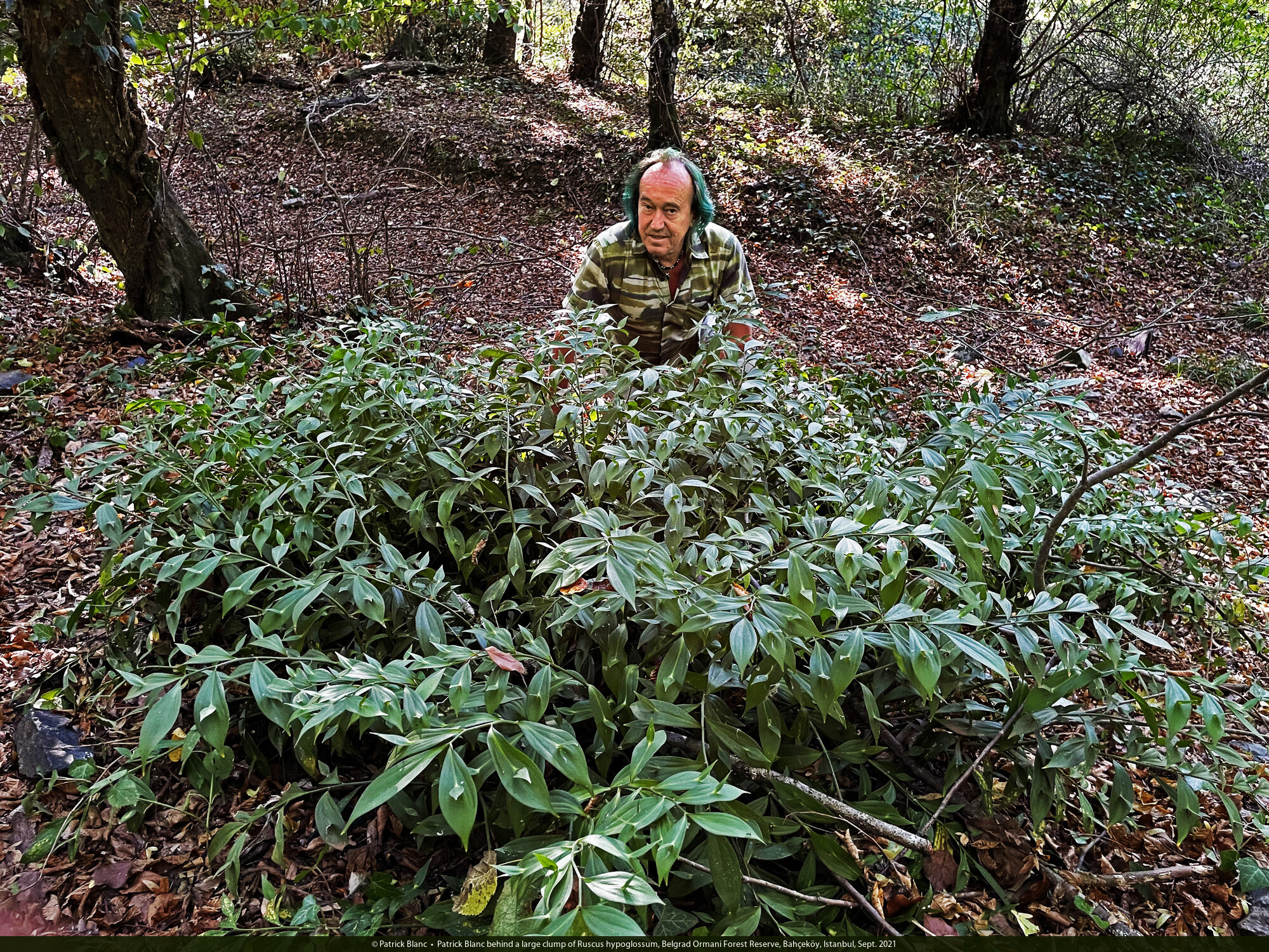 Patrick Blanc behind Ruscus hypoglossum, a form with long bracts emerging from the cladodes, Belgrad Ormani Forest Reserve, Bahçeköy, Istanbul, Sept. 2021