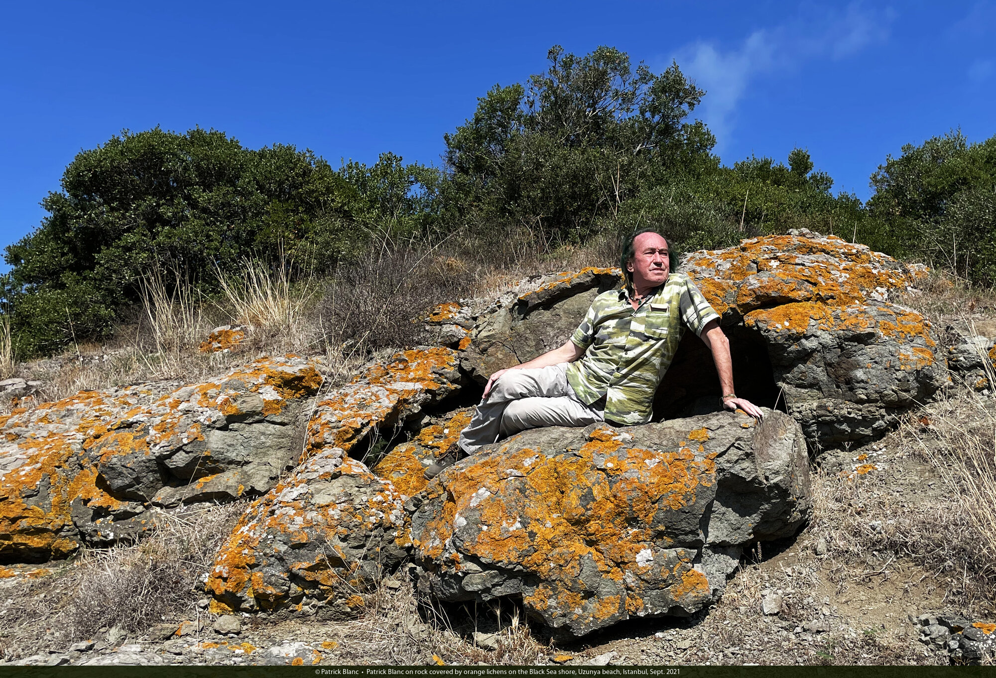Patrick Blanc on rock covered by orange lichens on the Black Sea shore, Uzunya beach, Istanbul, Sept. 2021