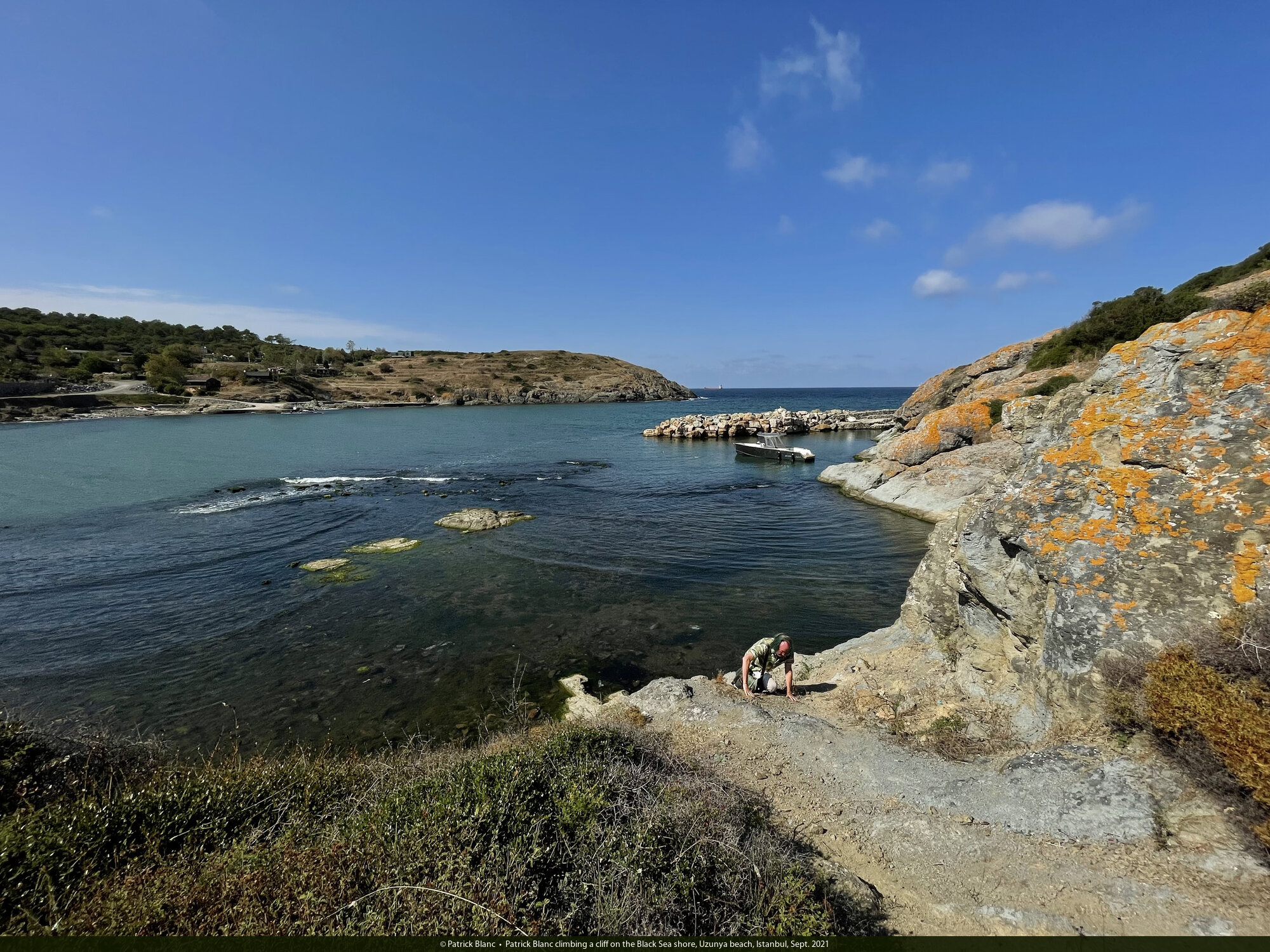 Patrick Blanc climbing a cliff on the Black Sea shore, Uzunya beach, Istanbul, Sept. 2021