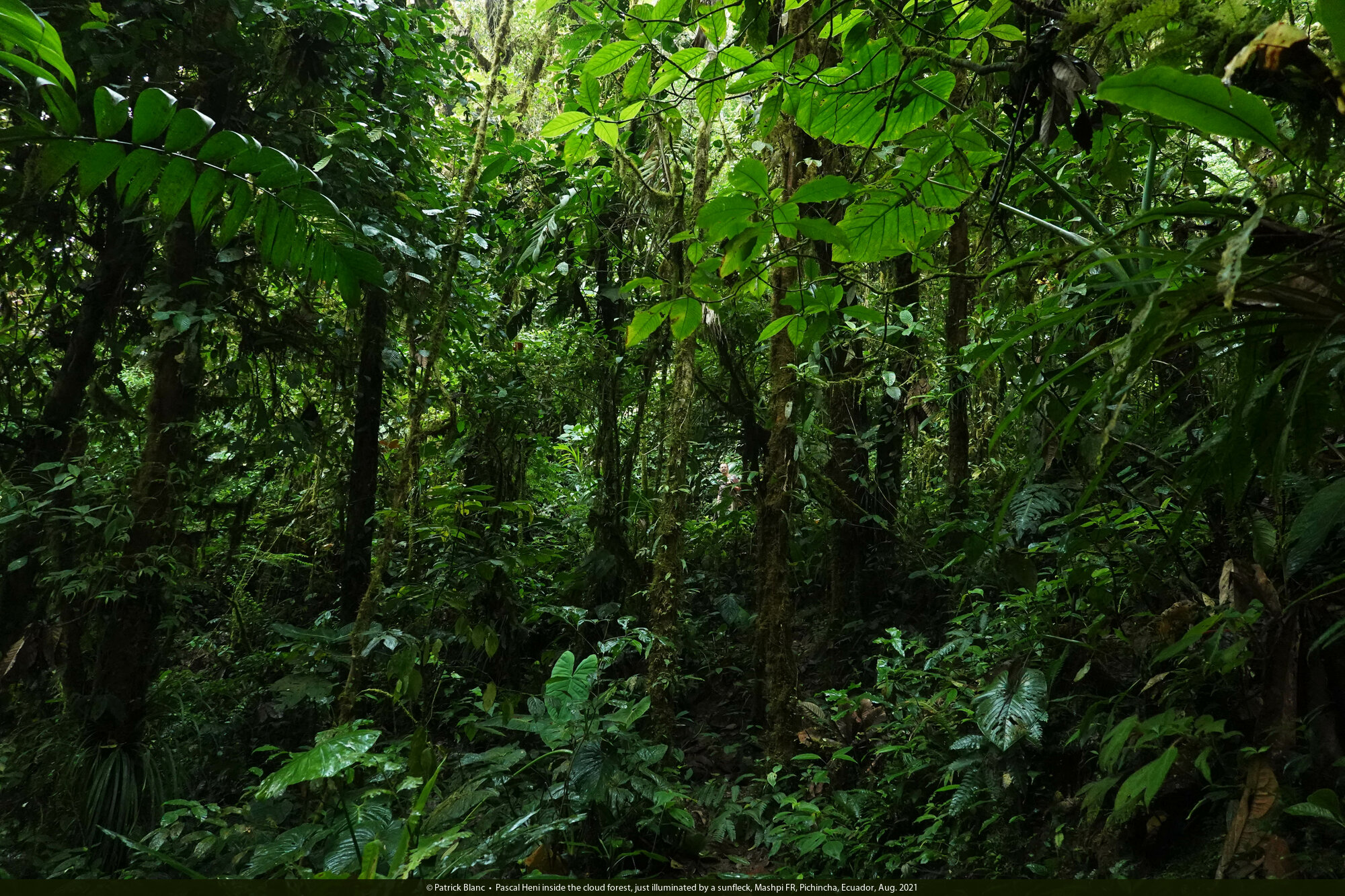 Pascal Heni inside the cloud forest, just illuminated by a sunfleck, Mashpi FR, Pichincha, Ecuador, Aug. 2021