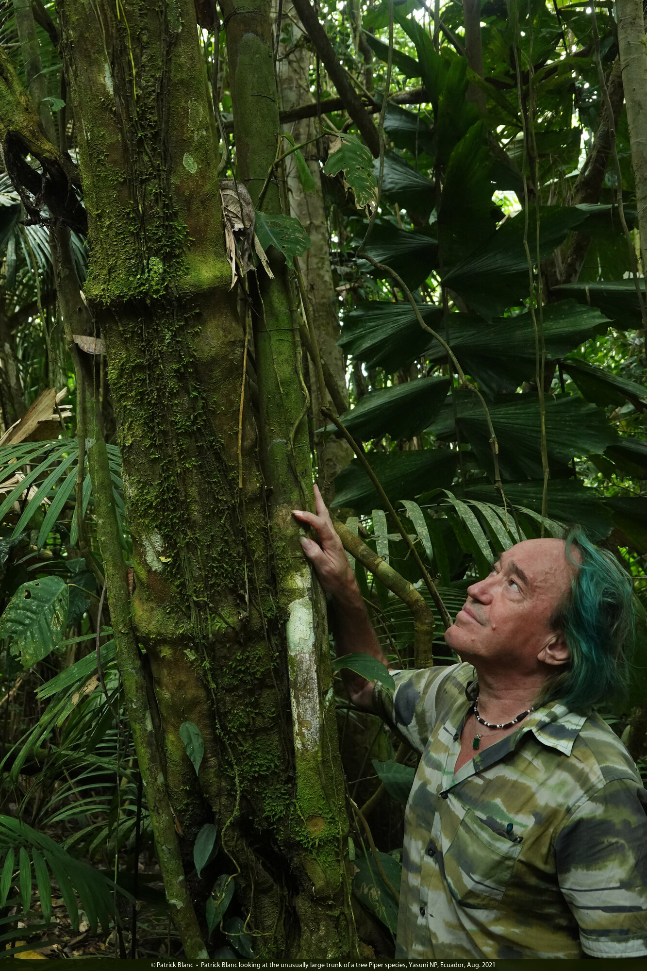 Patrick Blanc much intrigued by the unusually large trunk of a tree Piper amalago, Yasuni NP, Ecuador, Aug. 2021