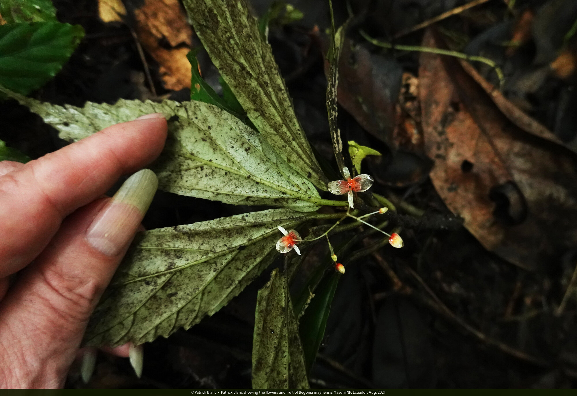 Patrick Blanc showing the flowers and fruit of Begonia maynensis, Yasuni NP, Ecuador, Aug. 2021