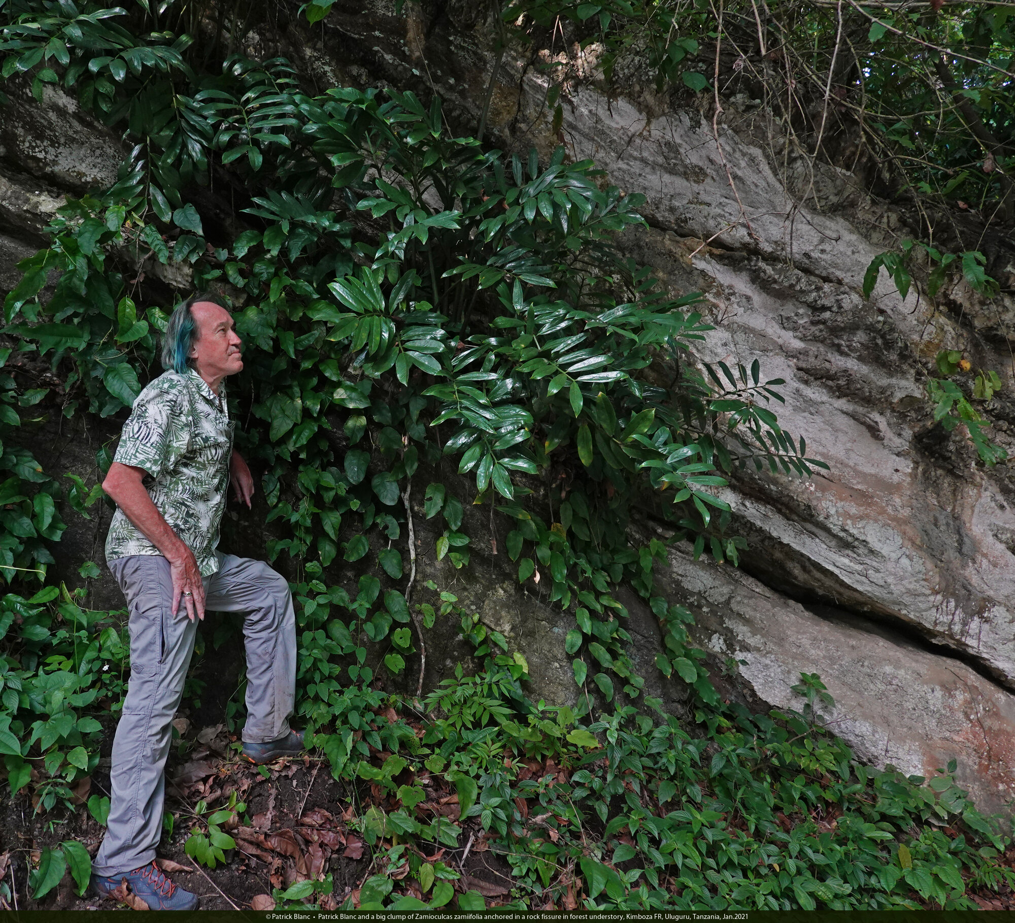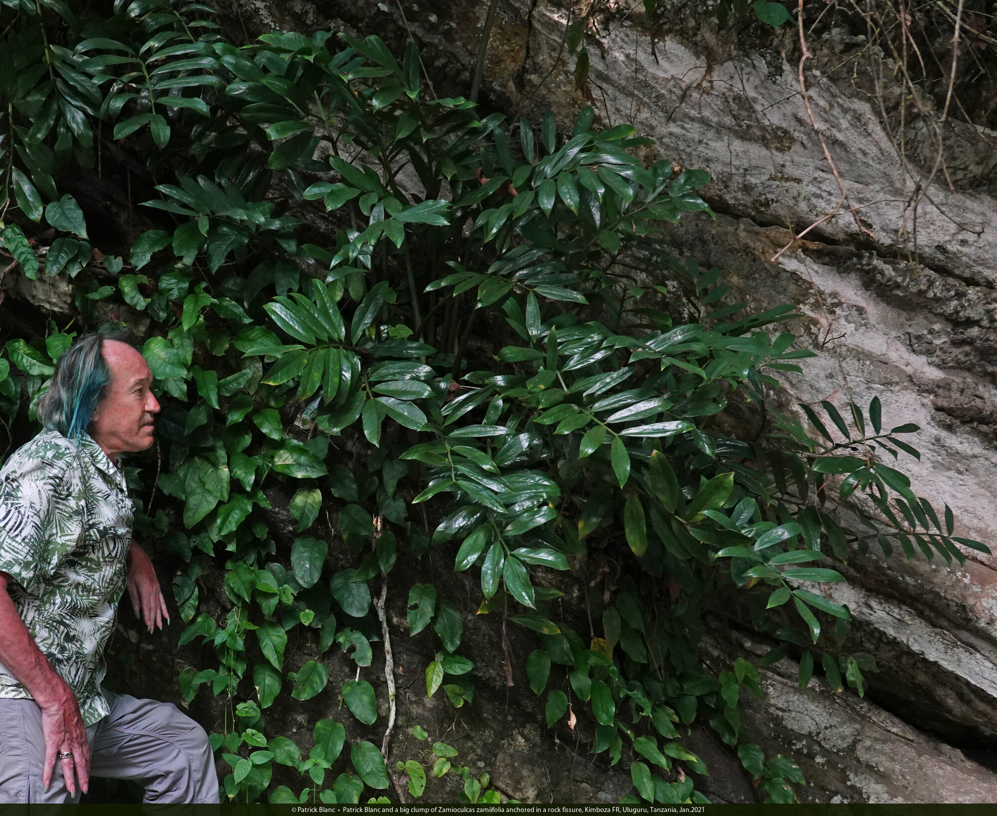 Patrick Blanc and a big clump of Zamioculcas zamiifolia anchored in a rock fissure, Kimboza FR, Uluguru, Tanzania, Jan.2021