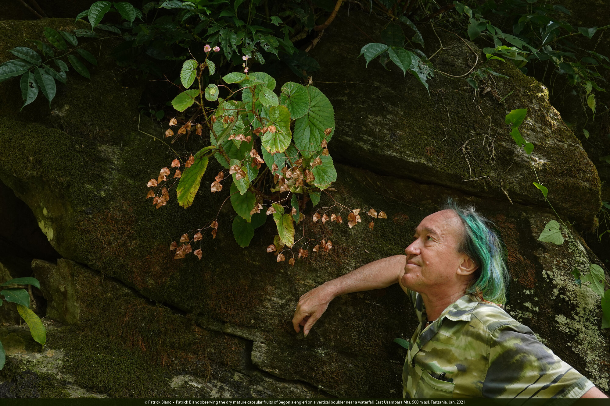 Patrick Blanc observing the dry mature capsular fruits of Begonia engleri on a vertical boulder near a waterfall, East Usambara Mts, 500 m asl, Tanzania, Jan. 2021