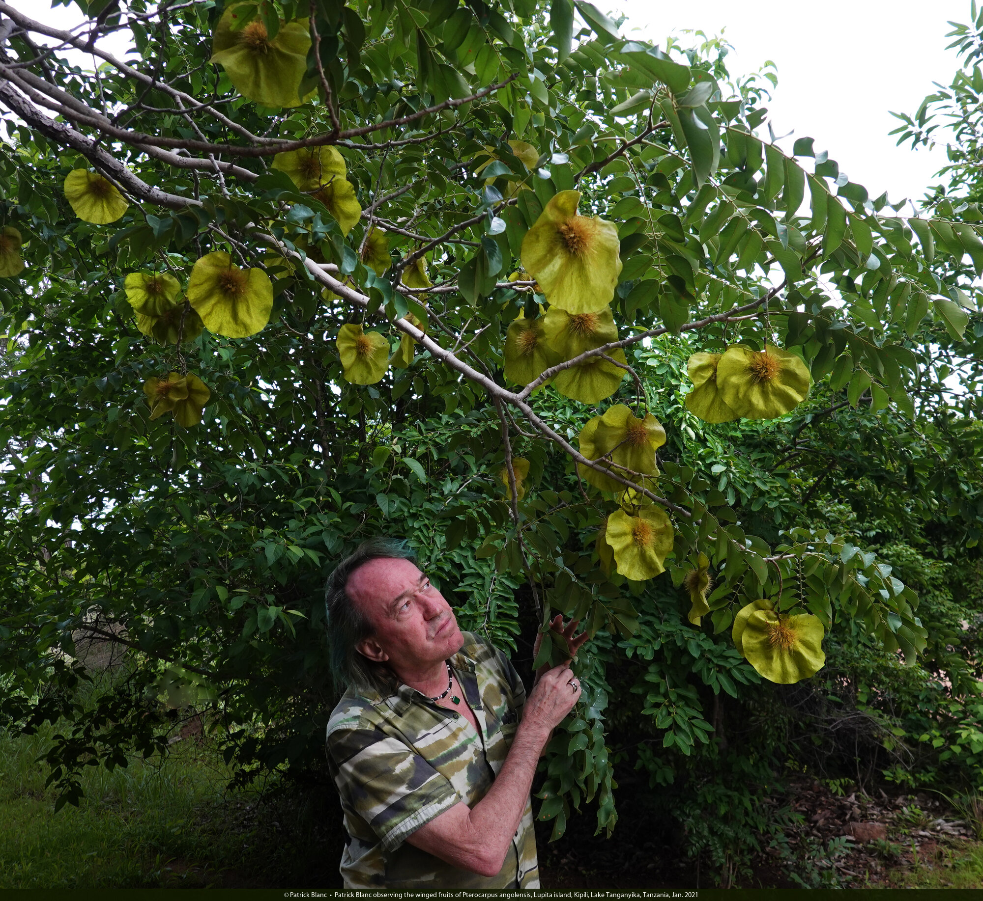 Patrick Blanc observing the winged fruits of Pterocarpus angolensis, Lupita island, Kipili, Lake Tanganyika, Tanzania, Jan. 2021