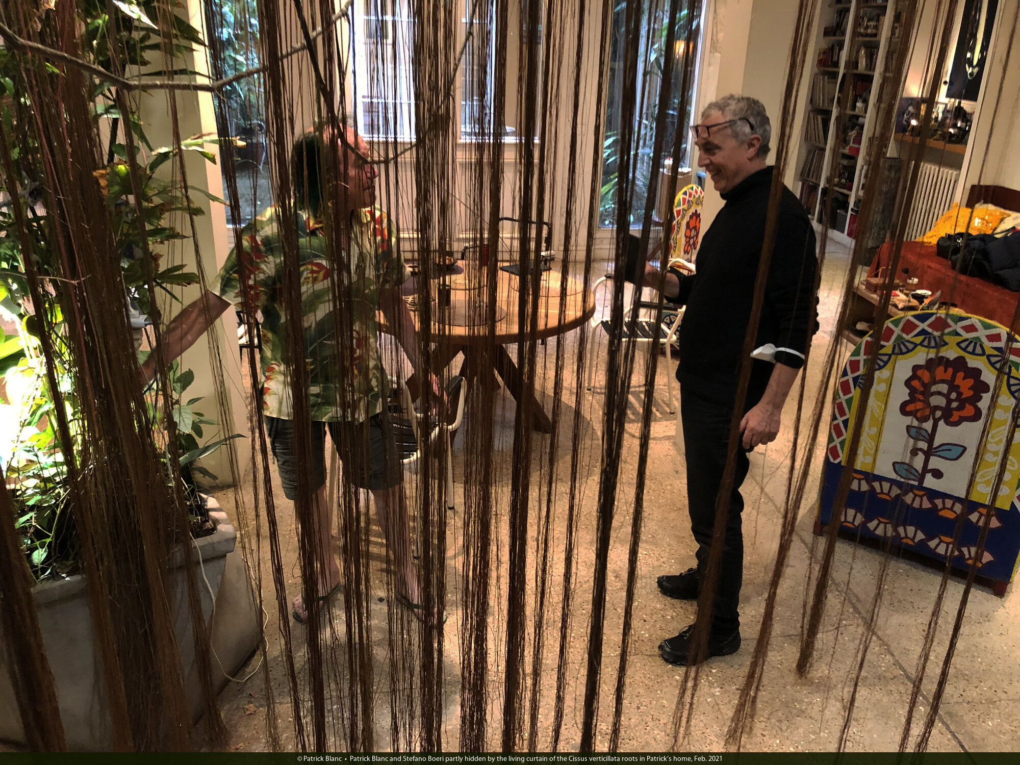 Patrick Blanc and Stefano Boeri partly hidden by the living curtain of the Cissus verticillata roots in Patrick's home, Feb. 2021