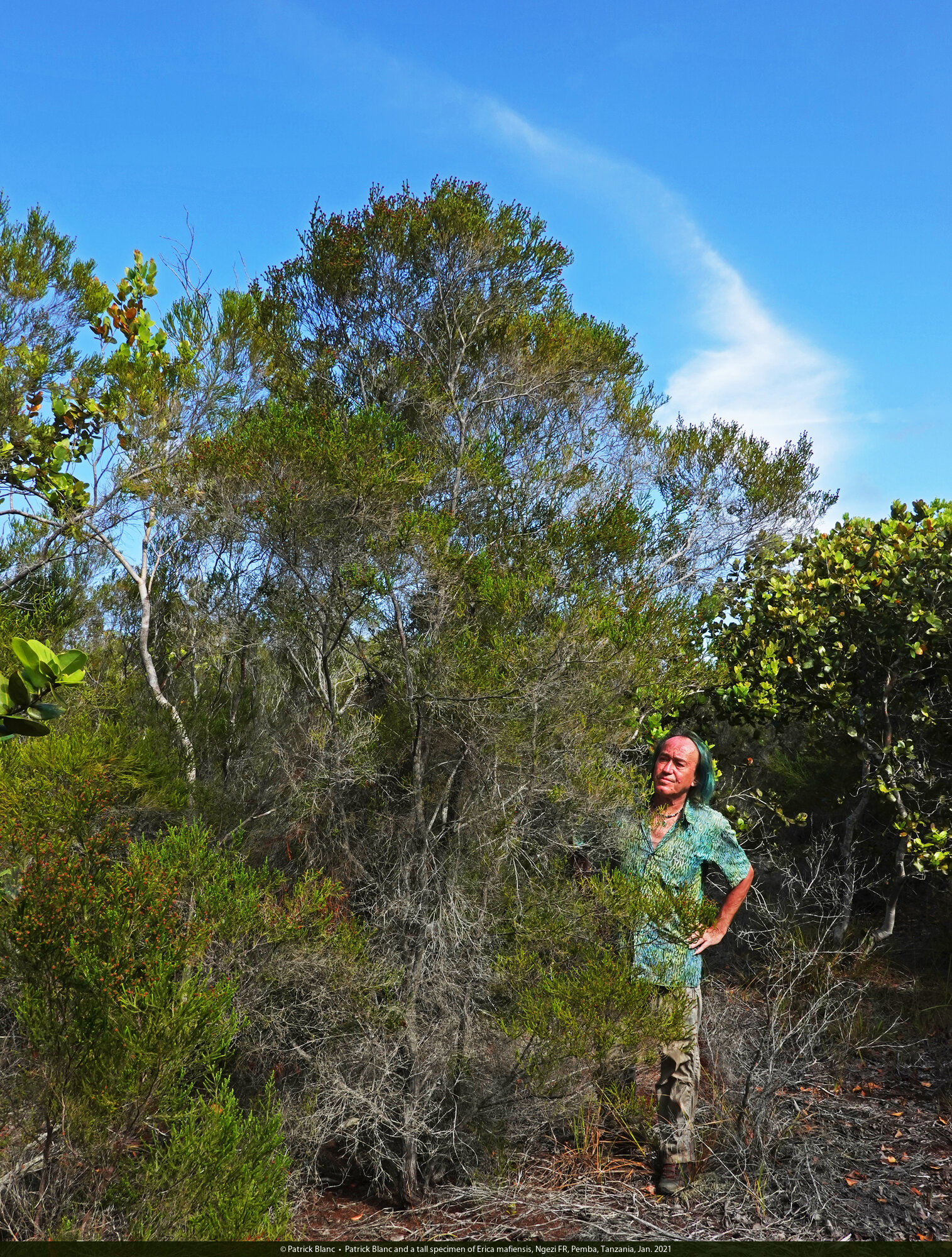 Patrick Blanc and a tall specimen of Erica mafiensis, Ngezi FR, Pemba, Tanzania, Jan. 2021