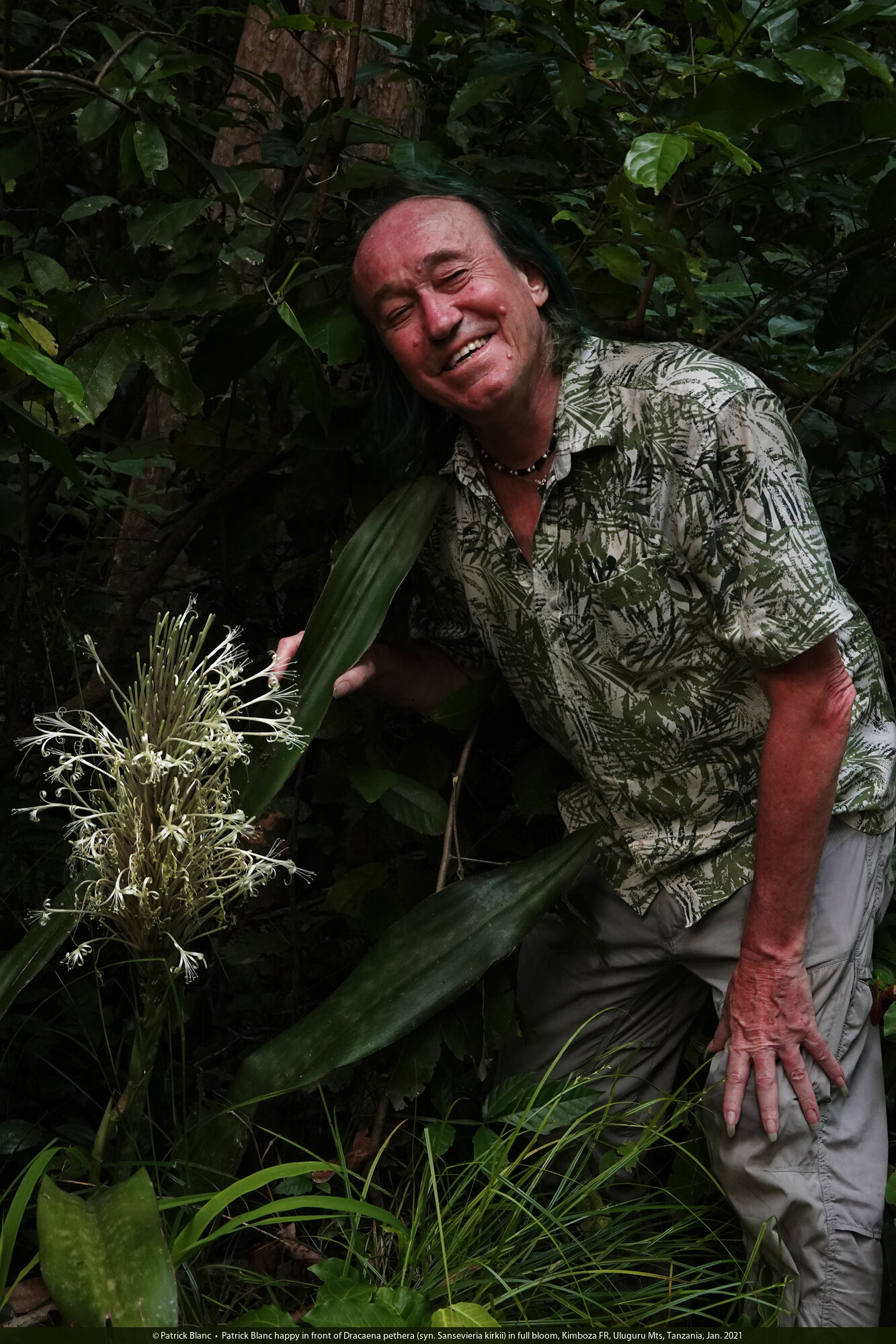 Patrick Blanc happy in front of Dracaena pethera (syn. Sansevieria kirkii) in full bloom, Kimboza FR, Uluguru Mts, Tanzania, Jan. 2021