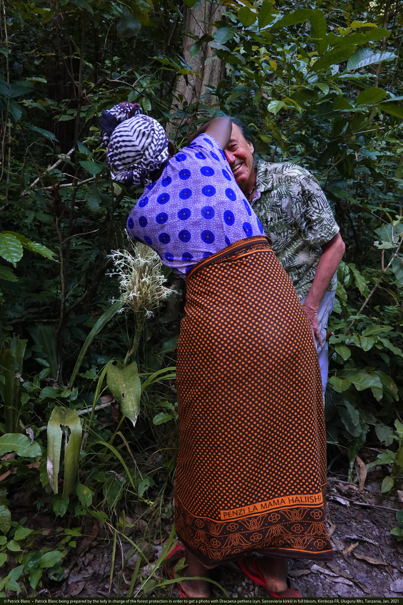 Patrick Blanc being prepared by the lady in charge of the forest protection in order to get a photo with Dracaena pethera (syn. Sansevieria kirkii) in full bloom, Kimboza FR, Uluguru Mts, Tanzania, Jan. 2021