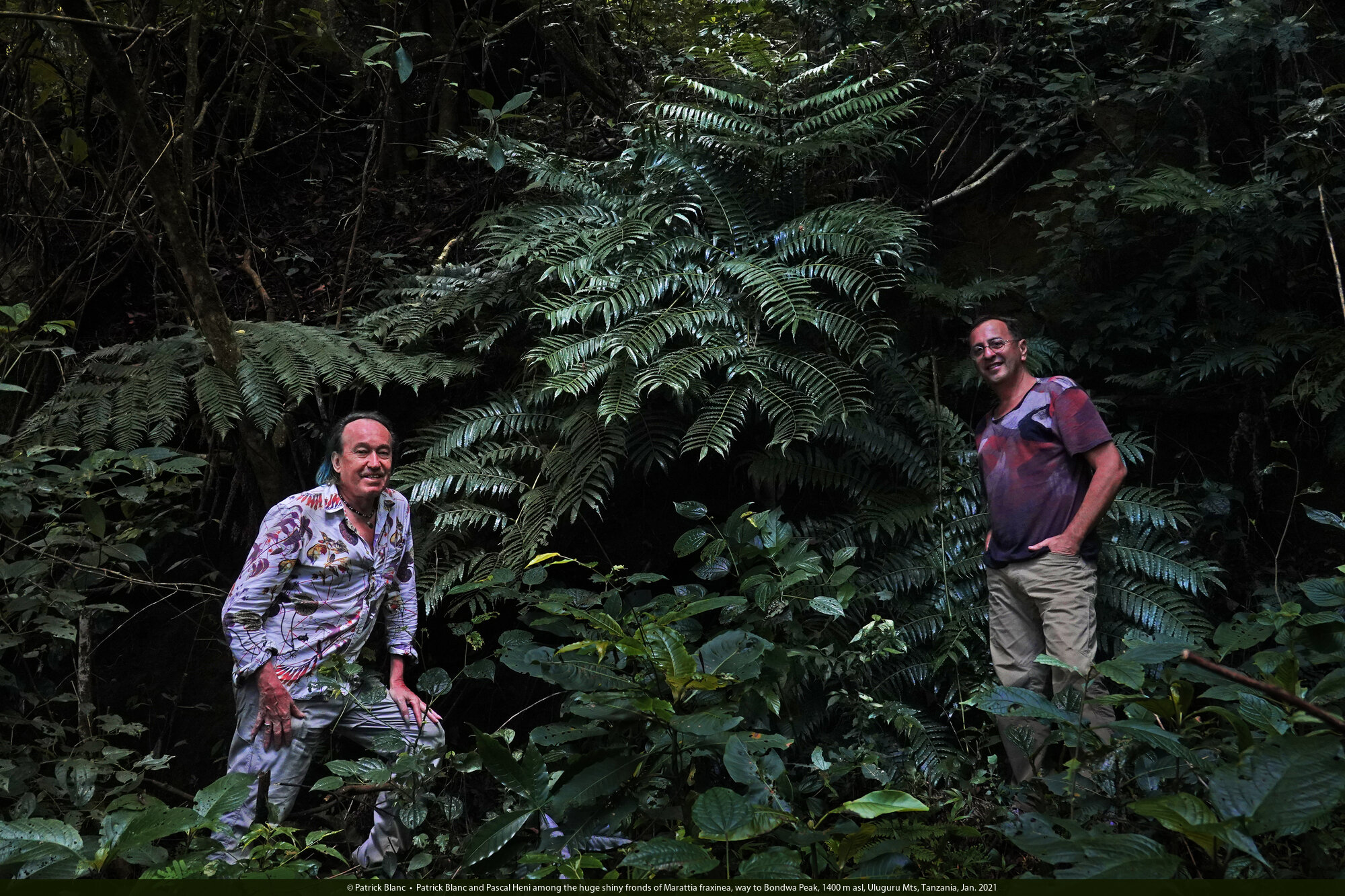 Patrick Blanc and Pascal Heni among the huge shiny fronds of Marattia fraxinea, way to Bondwa Peak, 1400 m asl, Uluguru Mts, Tanzania, Jan. 2021