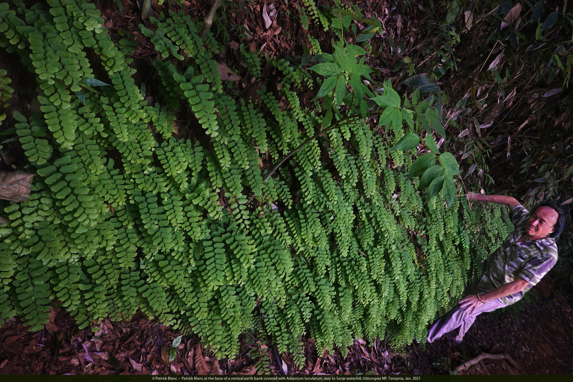 Patrick Blanc at the base of a vertical earth bank covered with Adiantum lunulatum, way to Sanje waterfall, Udzungwa NP, Tanzania, Jan. 2021