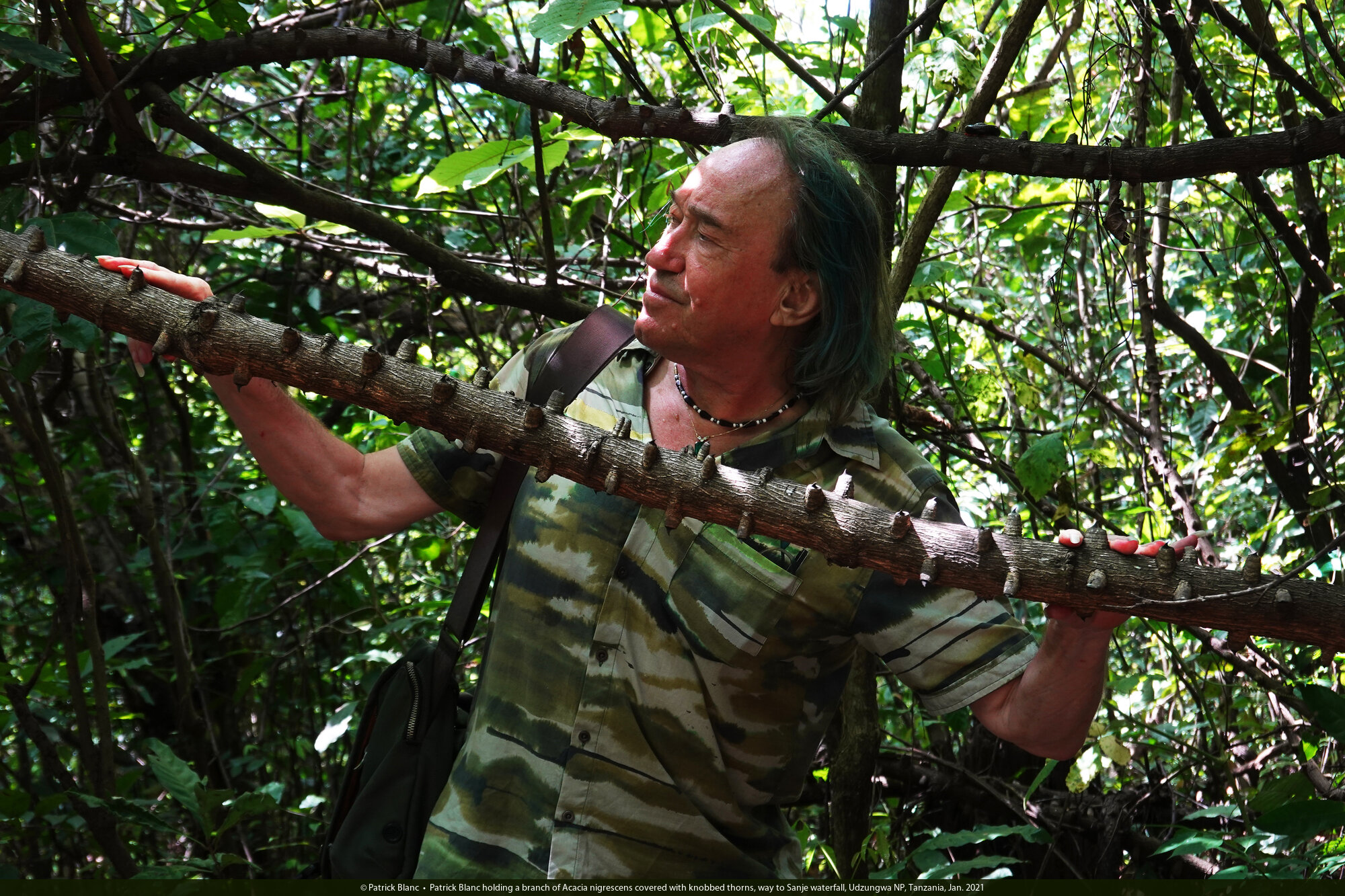 Patrick Blanc holding a branch of Acacia nigrescens covered with knobbed thorns, way to Sanje waterfall, Udzungwa NP, Tanzania, Jan. 2021