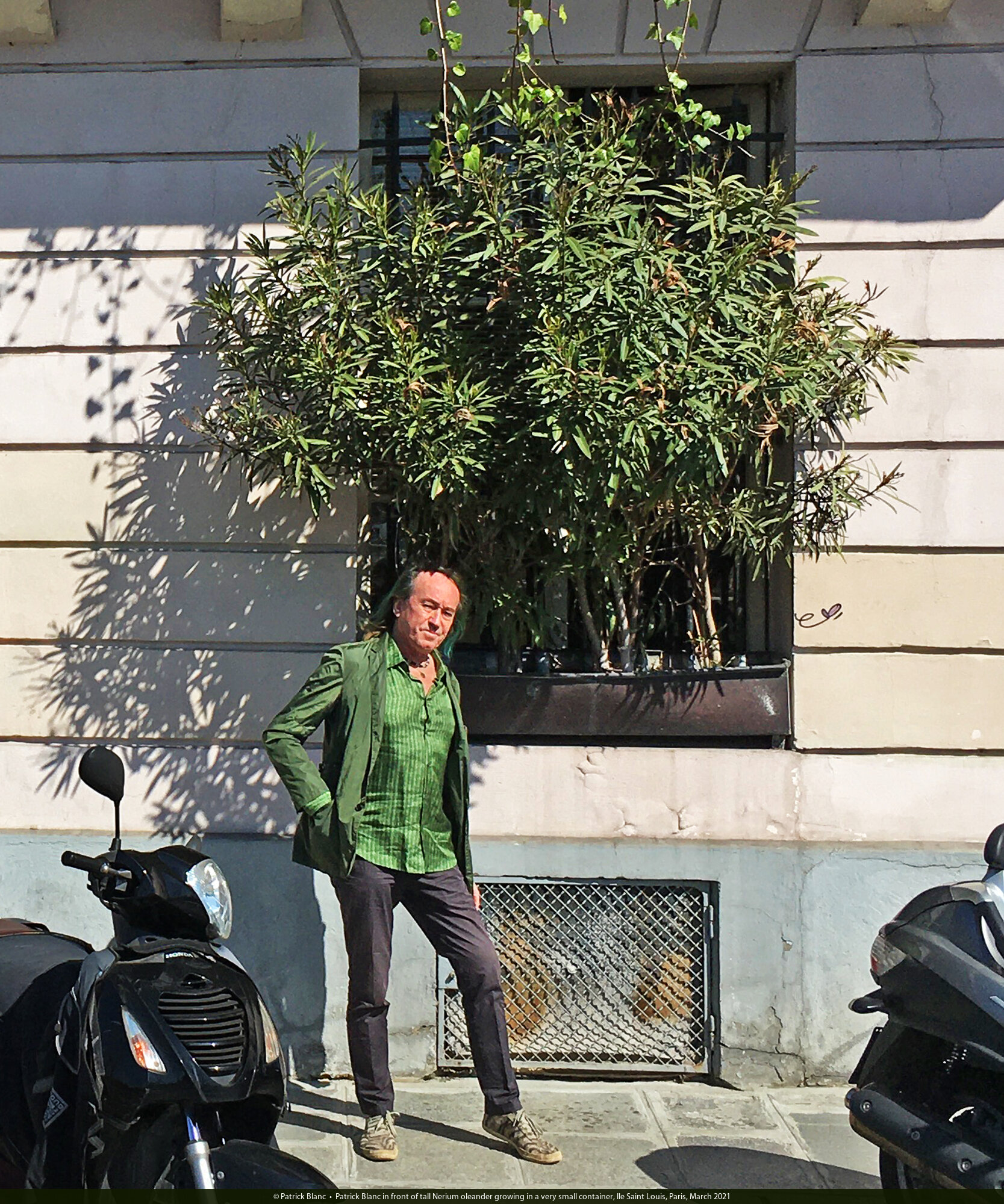Patrick Blanc in front of tall Nerium oleander growing in a very small container, Ile Saint Louis, Paris, March 2021
