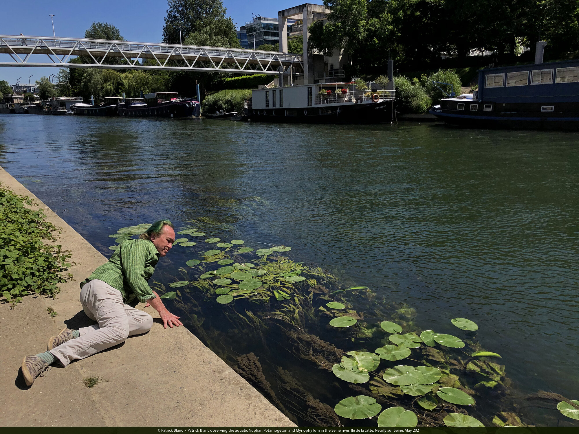 Patrick Blanc observing the aquatic Nuphar, Potamogeton and Myriophyllum in the Seine river, Ile de la Jatte, Neuilly sur Seine, May 2021