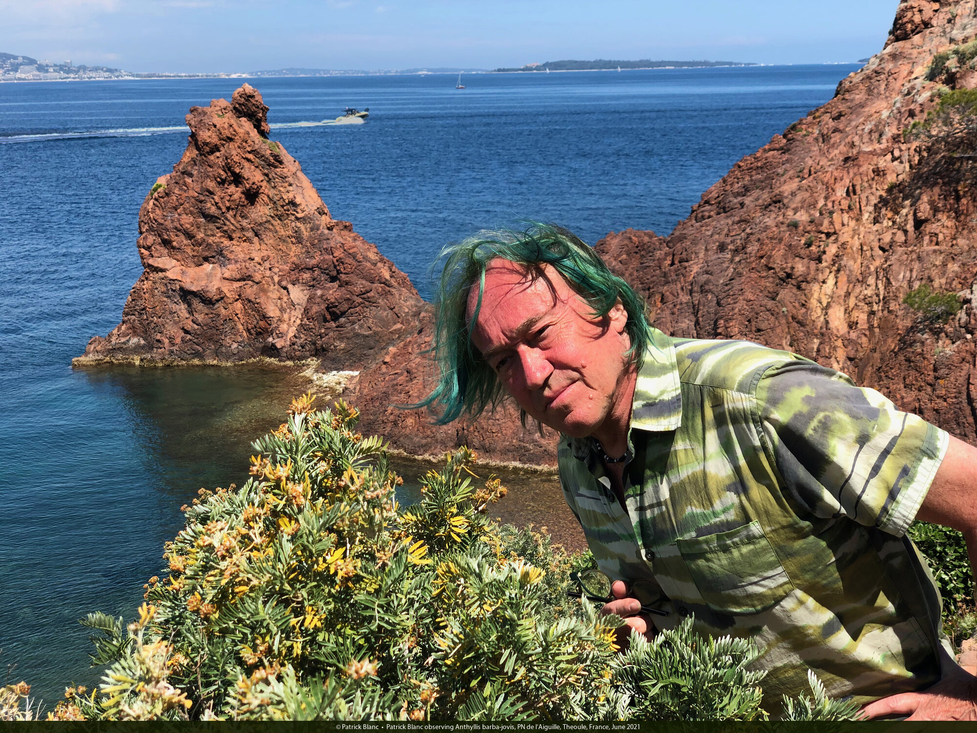 Patrick Blanc observing Anthyllis barba-jovis, PN de l'Aiguille, Theoule, France, June 2021