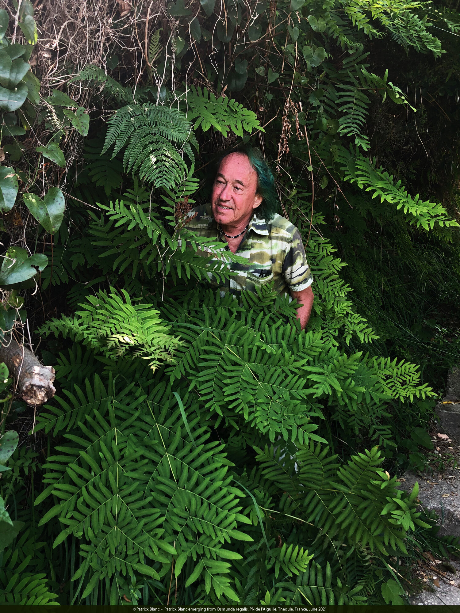 Patrick Blanc emerging from Osmunda regalis, PN de l'Aiguille, Theoule, France, June 2021