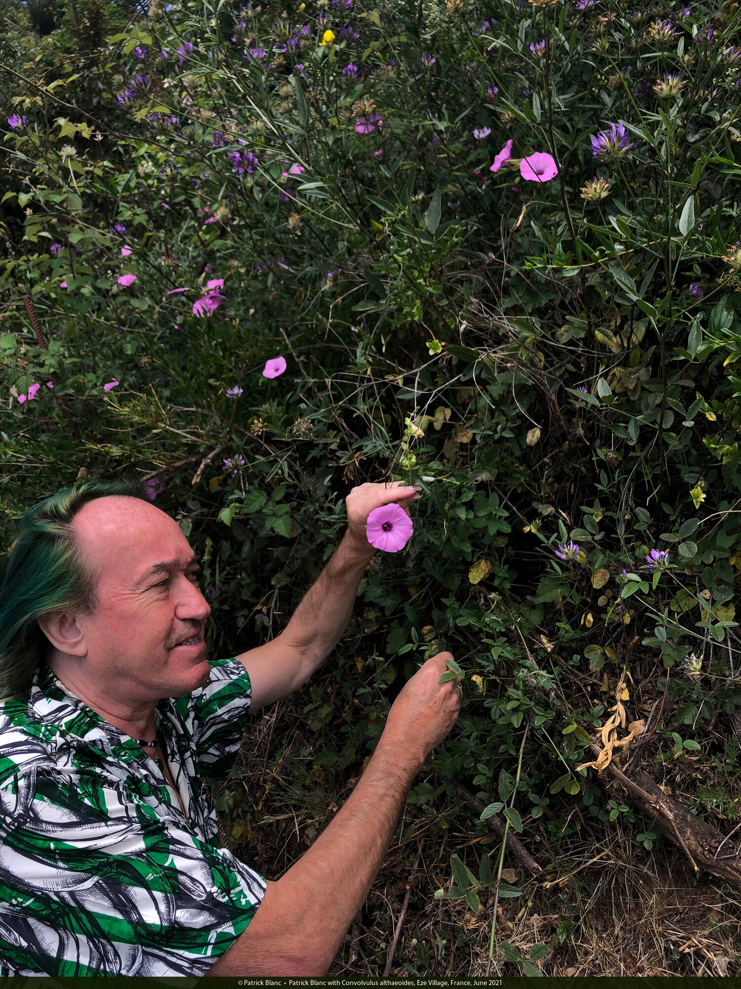 Patrick Blanc with Convolvulus althaeoides, Eze Village, France, June 2021