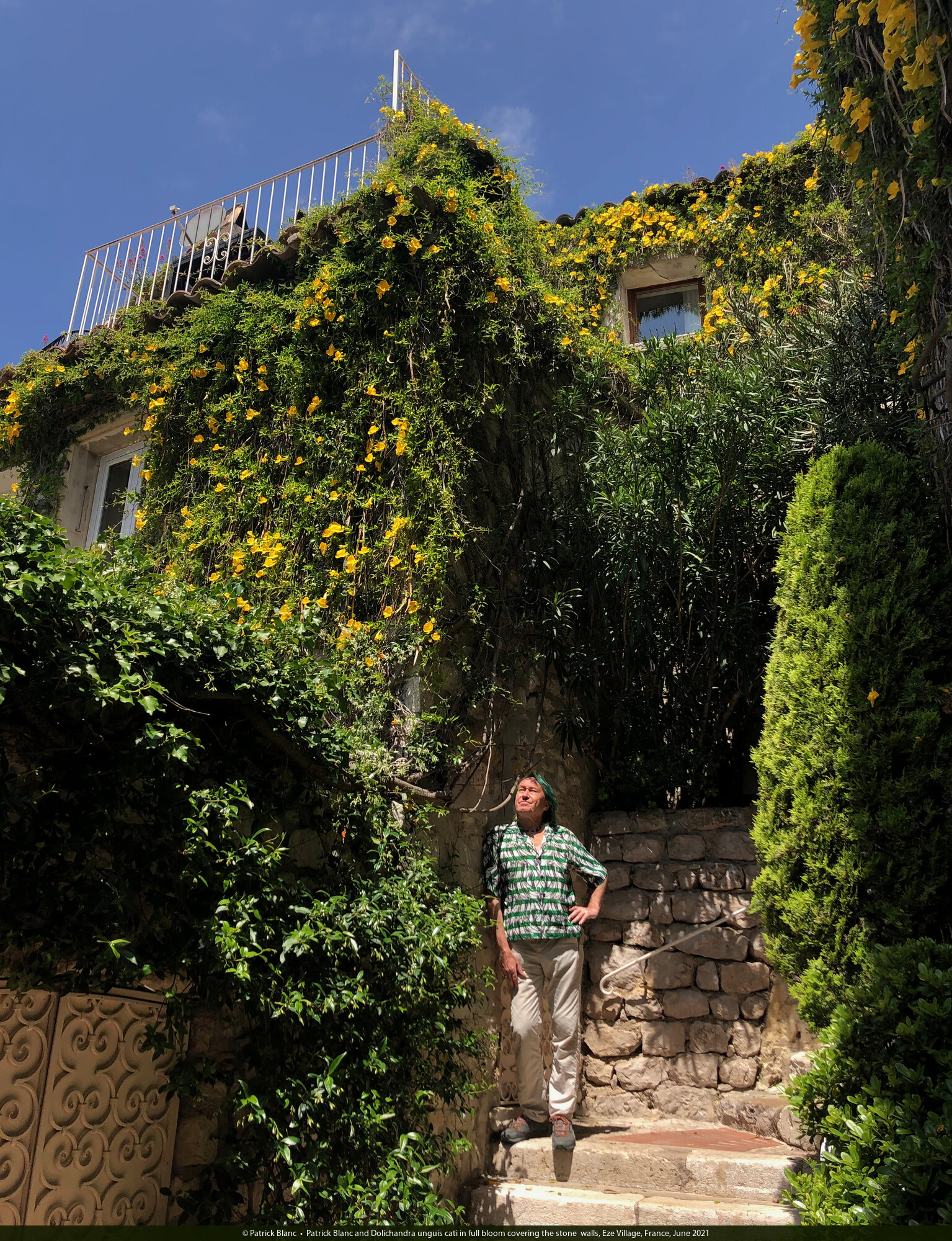 Patrick Blanc and Dolichandra unguis cati in full bloom covering the stone walls, Eze Village, France, June 2021